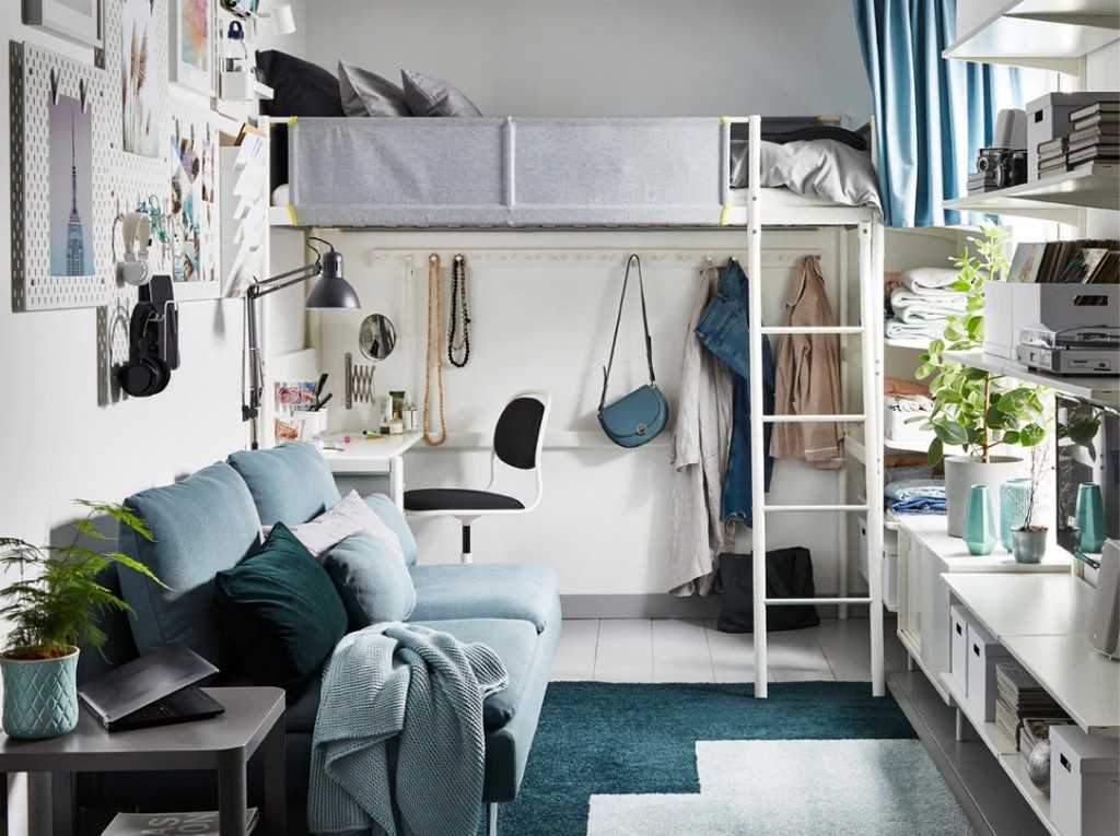 Кровать-чердак СТУВА от ИКЕА. Идеальное решение для детской комнаты или личного пространства для подростка. Посмотрите, насколько удобно разместили стол и кровать на нескольких квадратных метрах. На полках ребенок может хранить свои вещи, а за столом делать домашнее задание или рисовать, играть в компьютерные игры. Такое функциональное решение очень экономит место в небольших квартирах.