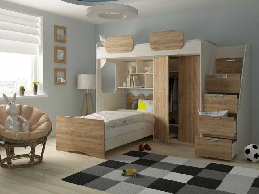 - Экономичность. Двухъярусная кровать с лестницей и шкафом обойдется дешевле, чем покупка всех предметов мебели по отдельности. Кроме того, весь комплекс выдержан в едином стиле, а значит не надо тратить время на поиск подходящего по дизайну мебельного гарнитура.