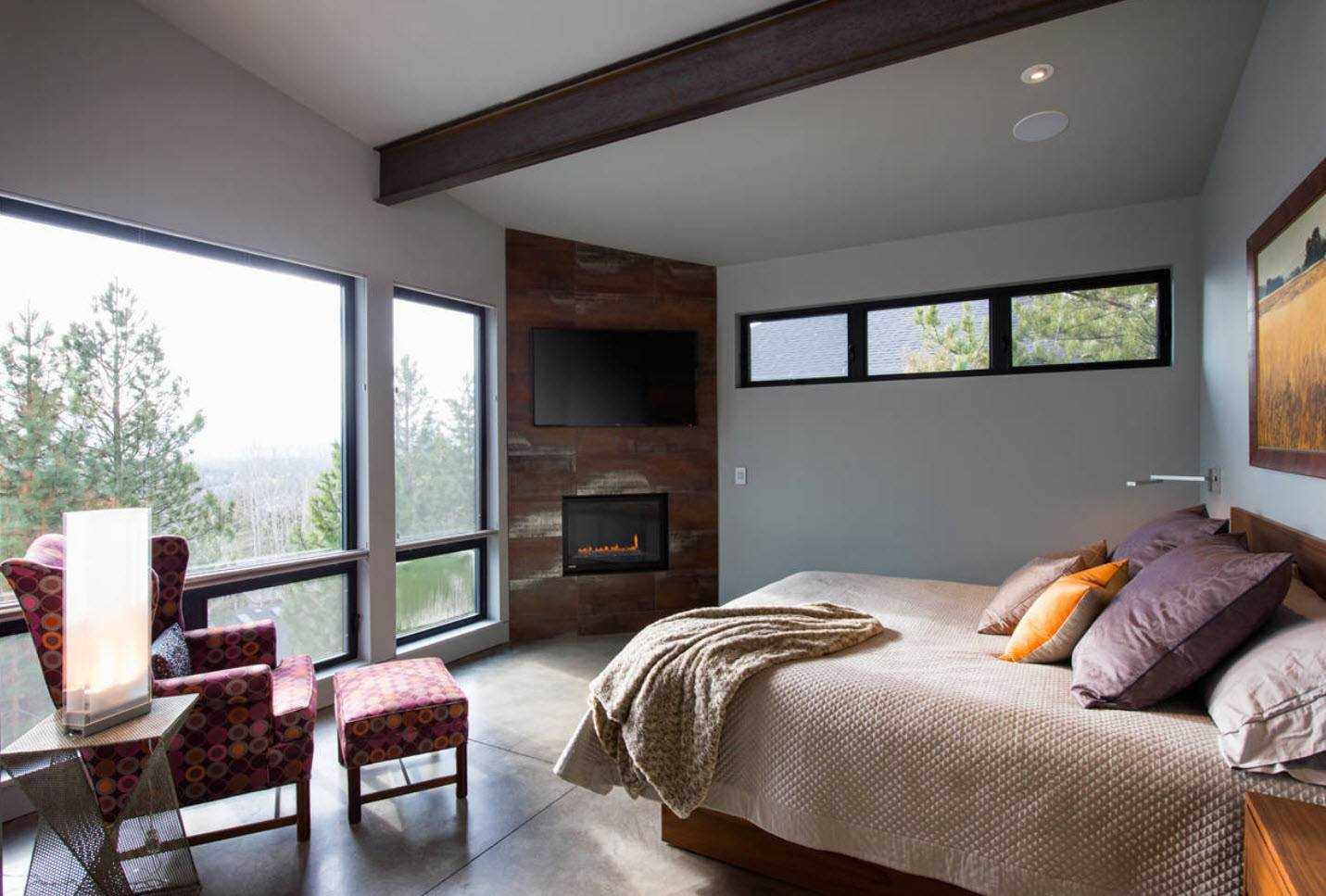На фото интерьер спальни на мансарде с двуспальной кроватью коричневого оттенка.