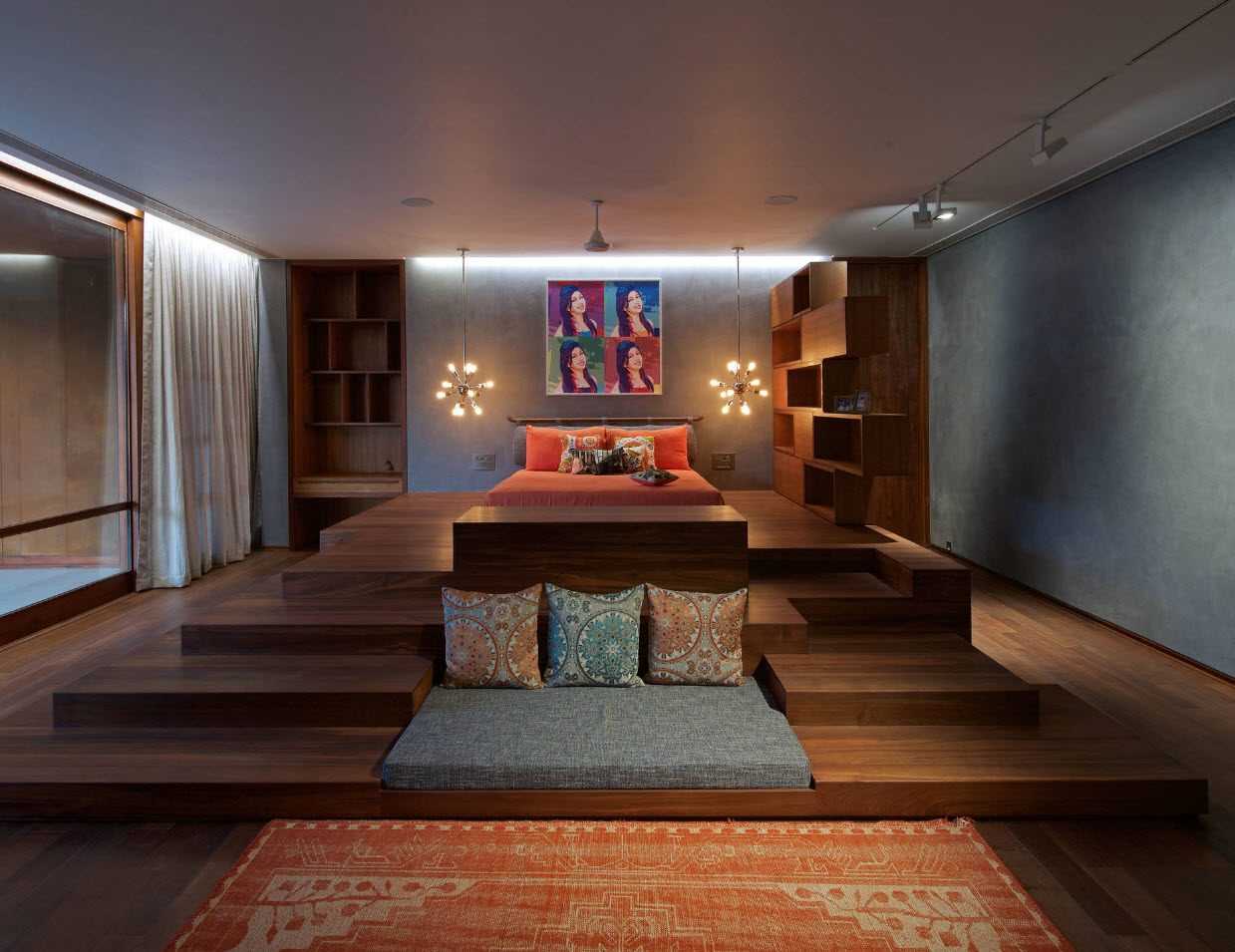 - Достаточно интересно в интерьере спальни смотрится круглая кровать. Диаметр такой кровати обычно не менее 200 см, однако, для сна двоих человек она не очень комфортна, кроме того, занимает достаточно много места. Подбор постельного белья и аксессуаров по форме также может вызвать сложность.