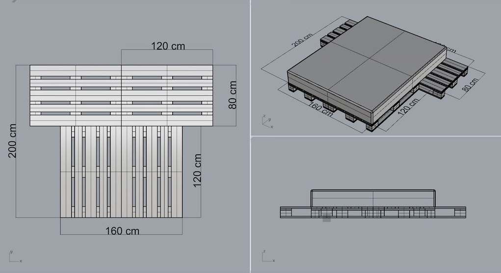 Либо же понадобится три поддона, тогда располагают по-другому — ширина такой кровати — 1200 мм, а длина остаётся такой же — 2400 мм. Площадь спального места в первом случае получается 1.92 кв. м., а во втором — 2.88 кв. м. Соответственно первый вариант подходит лучше для отдыха деток, а второй для мамы или другого члена семьи, так как он односпальной.