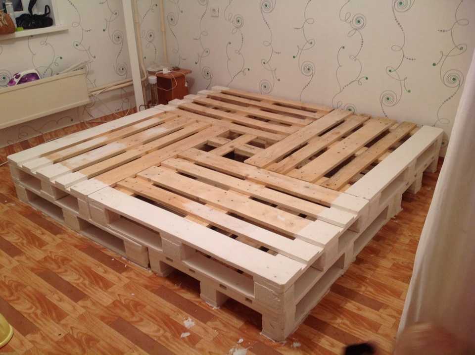 При изготовлении спального места для взрослых людей (двуспальная) понадобится четыре или восемь поддонов, если хотите место отдыха повыше, размерами 1.2 метра на 0.8 метра. Располагают один за другим, так чтобы длина кровати получилась 2.4 метра, а ширина 1.6 метра. Ещё один вариант — квадратом, правда посередине остаётся свободное место. Его заделывают заранее выпиленным квадратным куском поддона со сторонами в 40 см, или заполняют доской крест-накрест, этот вариант показан на фото, что находится ниже, тогда кровать получается квадратной — 2 на 2 метра.