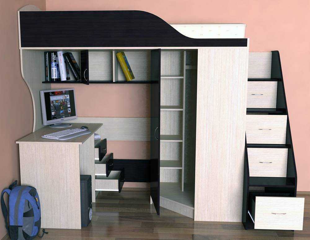 Этот вид двухъярусных кроватей предназначен для одного ребенка. Верхний «этаж» занимает непосредственно спальное место, а на нижнем располагается рабочая зона, которая включает в себя стол, полочки, а иногда и шкаф. Лестница в таких моделях, как правило, выполнена под наклоном, в каждую ступеньку спрятана выдвижная полка. Подобная мебель за счет того, что кровать расположена на втором ярусе, экономит очень много места, при этом обеспечивая ребенка всем необходимым для работы и сна.