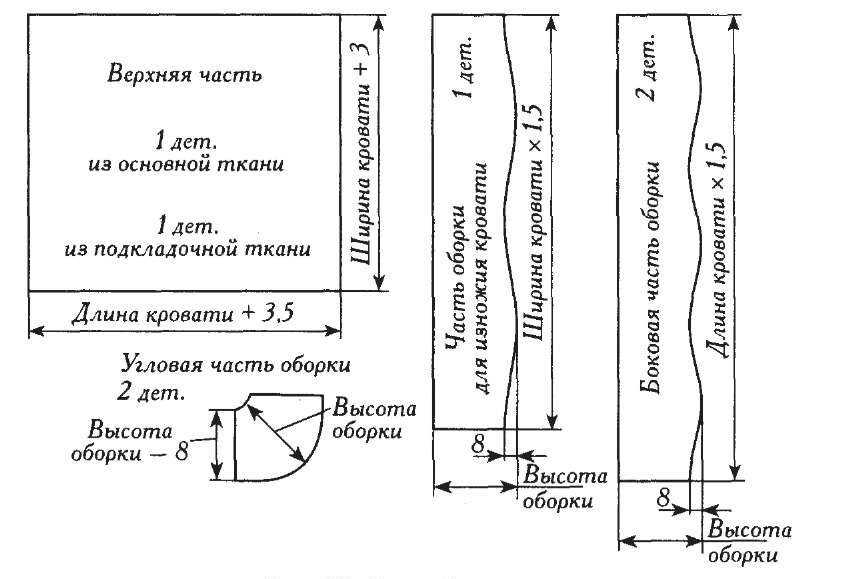 Если ширина выбранной вами ткани 2,8 м, то вам наверняка хватит одинарной длины изделия, а остатков материала от ширины должно хватить на оборки. Если полотно 1,4 м, то закладываем две длины основного полотна и суммарную длину всех сторон с оборкой. Но тогда расход ткани выйдет намного больше, а качество и эстетика покрывала за счет большего количества швов ухудшатся.