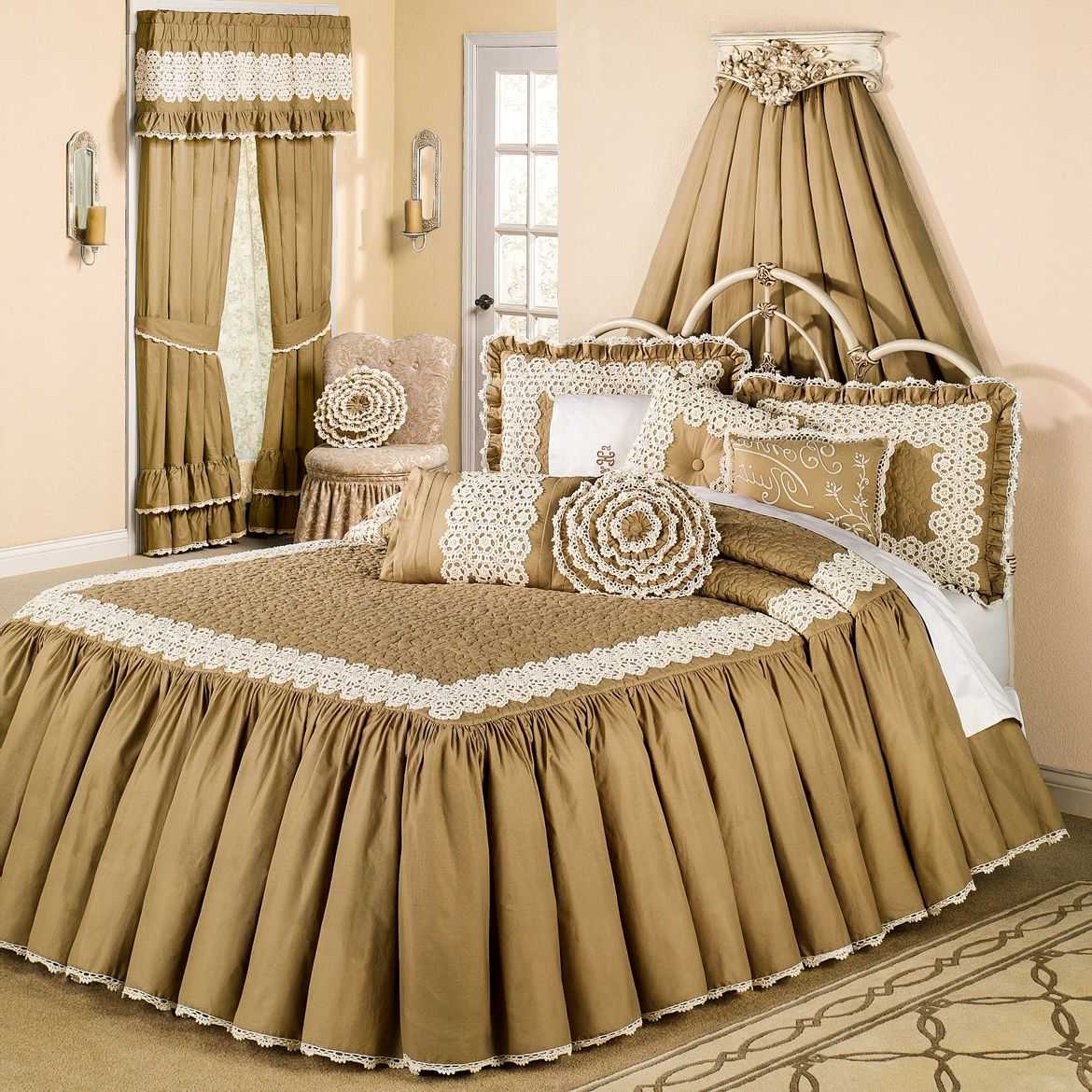 Такими моделями украшают высокие кровати, а также модели с толстыми матрасами. Покрывало с подзором сделает интерьер одновременно торжественным, романтичным и изысканным. Они бывают строгими, пышными, легкими, плотными, стегаными, фактурными. Их декорируют рюшами, складками, бантами, несколькими рядами оборок.