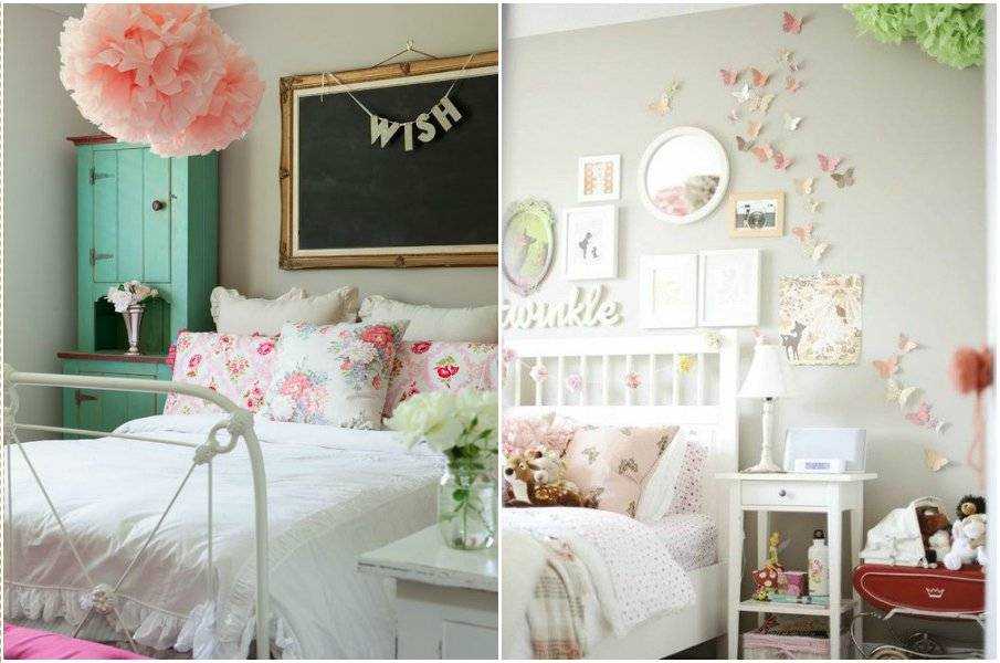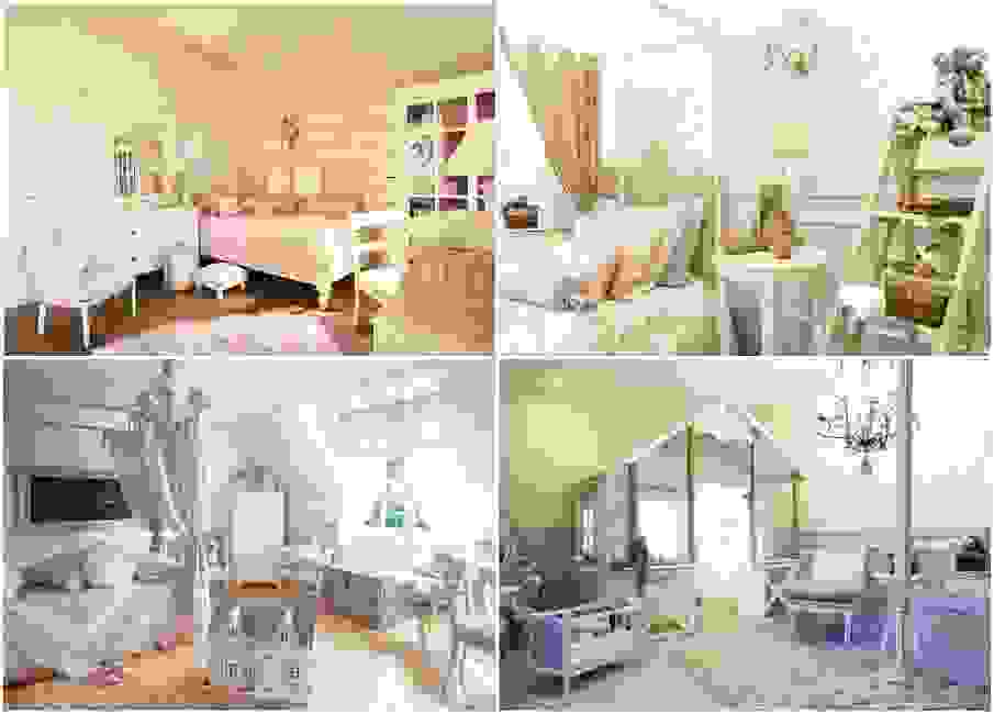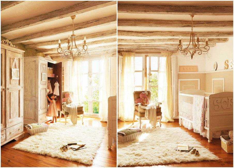 В детской сочетает классику и деревенский прованс, отличается потертостью мебели или эффектом реставрации. Цвета подбираются пастельные, для мальчика – бежевый, серый, голубой, зеленый, а для девочки – пастельно-фиолетовый, светло-желтый, розовый оттенок, рюши, оборки и банты, балдахин.