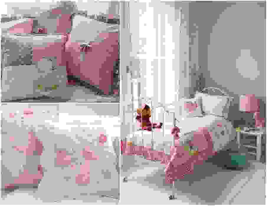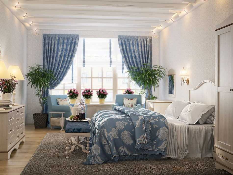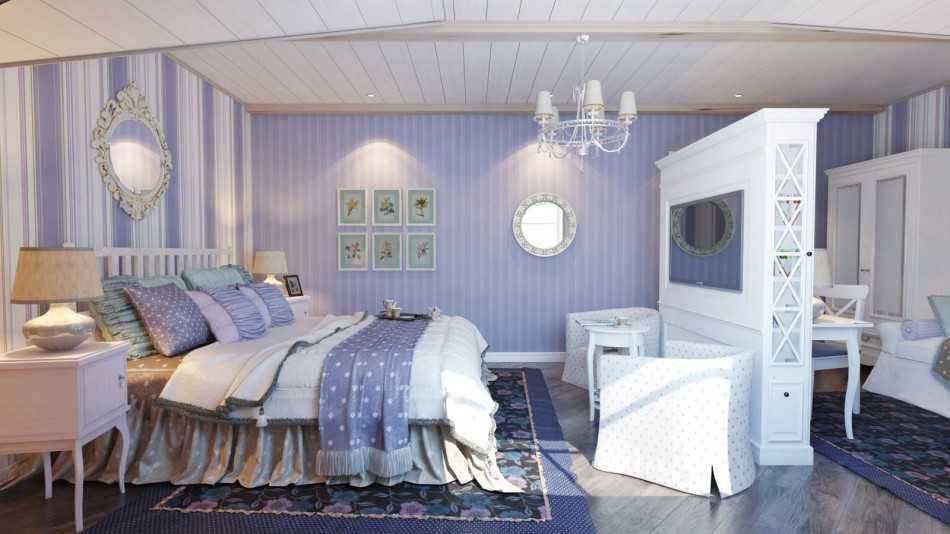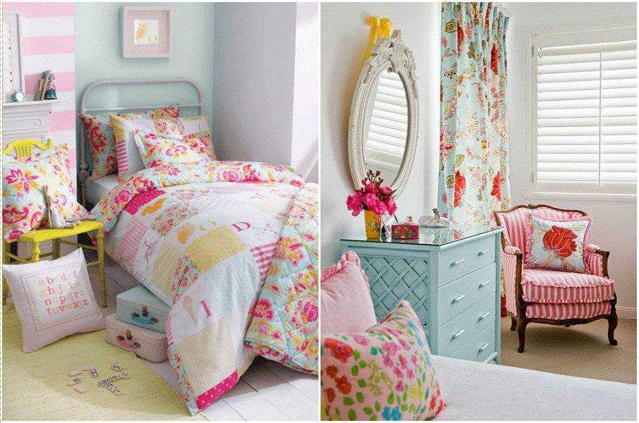 При оформлении можно использовать различные покрывала для кроватей. Покрывало должно быть с цветочными мотивами, но оно может быть и однотонным. На нем могут быть изображены как клетки, так и полоски.