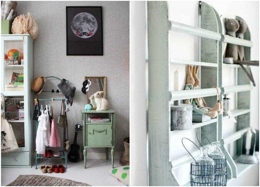 В детской создается эстетическими состаренными вещами, чаще используется для комнат девочек. Кровать может быть из дерева с трещинками, или из металла с витым изголовьем. Обои используются только с орнаментом, светильники с тканевым абажуром, комод, выдвижные ящики, кукла Тильда, модели ретро авто, почтовые марки, саквояж.
