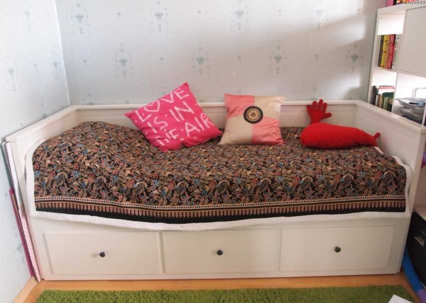 Кушетки. Среди них черная «Фиресдаль» и белая «Рамста». Ширина каждой из них составляет 88 см и 97 см соответственно, хватит на одного человека. С помощью мягких подушек у спинки можно создать место для сидячего отдыха. Кушетка «Фиресдаль» способна трансформироваться в двуспальную ковать. У обоих изделий реечное дно. Ковка незамысловатая: у «Фиресдаль» она представляет собой параллельные балки, а у модели «Рамста» спинка чуть более сложная, с добавлением разных фигур и направляющих.