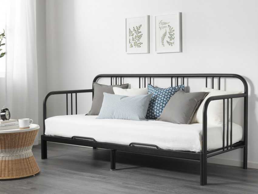 Кушетки. Среди них черная «Фиресдаль» и белая «Рамста». Ширина каждой из них составляет 88 см и 97 см соответственно, хватит на одного человека. С помощью мягких подушек у спинки можно создать место для сидячего отдыха. Кушетка «Фиресдаль» способна трансформироваться в двуспальную ковать. У обоих изделий реечное дно. Ковка незамысловатая: у «Фиресдаль» она представляет собой параллельные балки, а у модели «Рамста» спинка чуть более сложная, с добавлением разных фигур и направляющих.