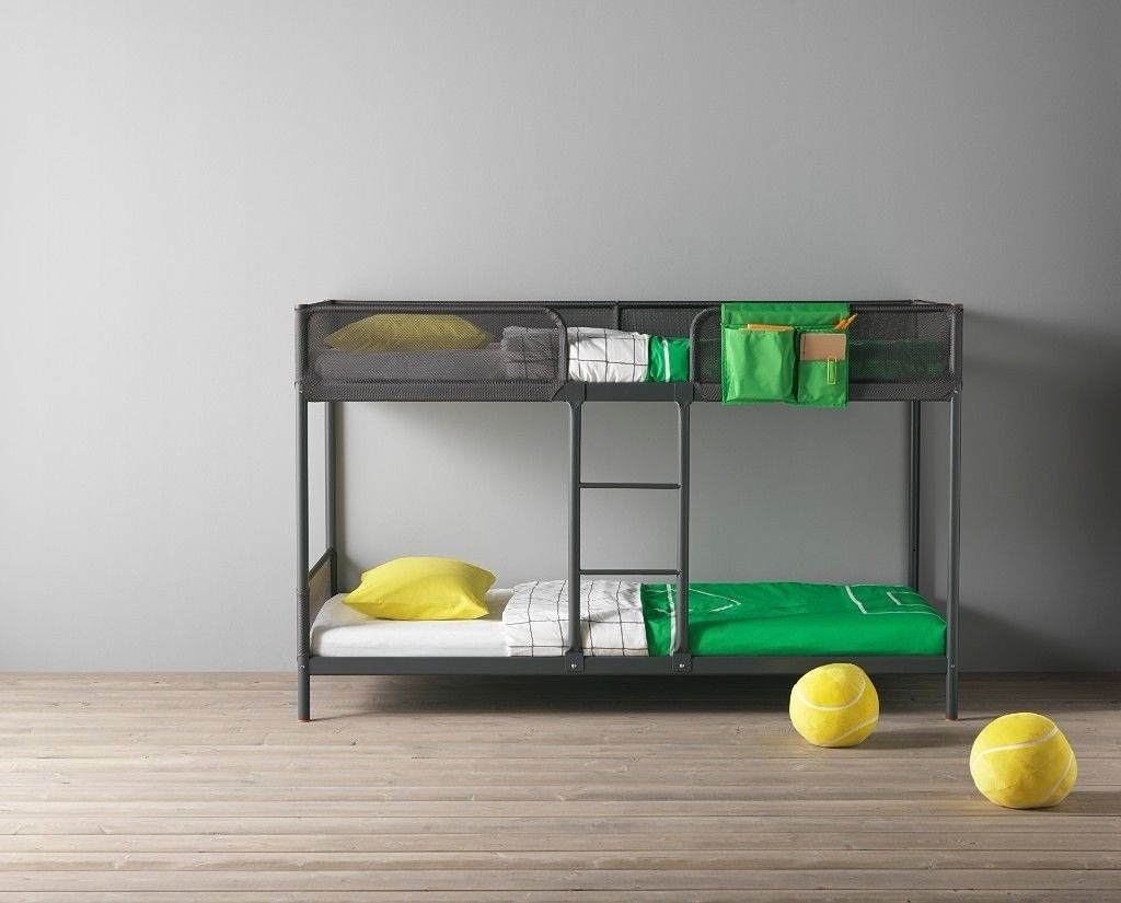Двухъярусные. Модель «Туффинг» представлена в виде кровати-чердака и кровати с двумя спальными местами. Лестница находится посередине, в качестве бортика выступает снимающаяся полиэстровая сетка. Серая и белая модели «Свэрта» также представлены в двух видах, кроме того, есть возможность приобрести третье спальное место – выкатывающуюся платформу. В целом дизайн двухъярусных изделий лаконичен.