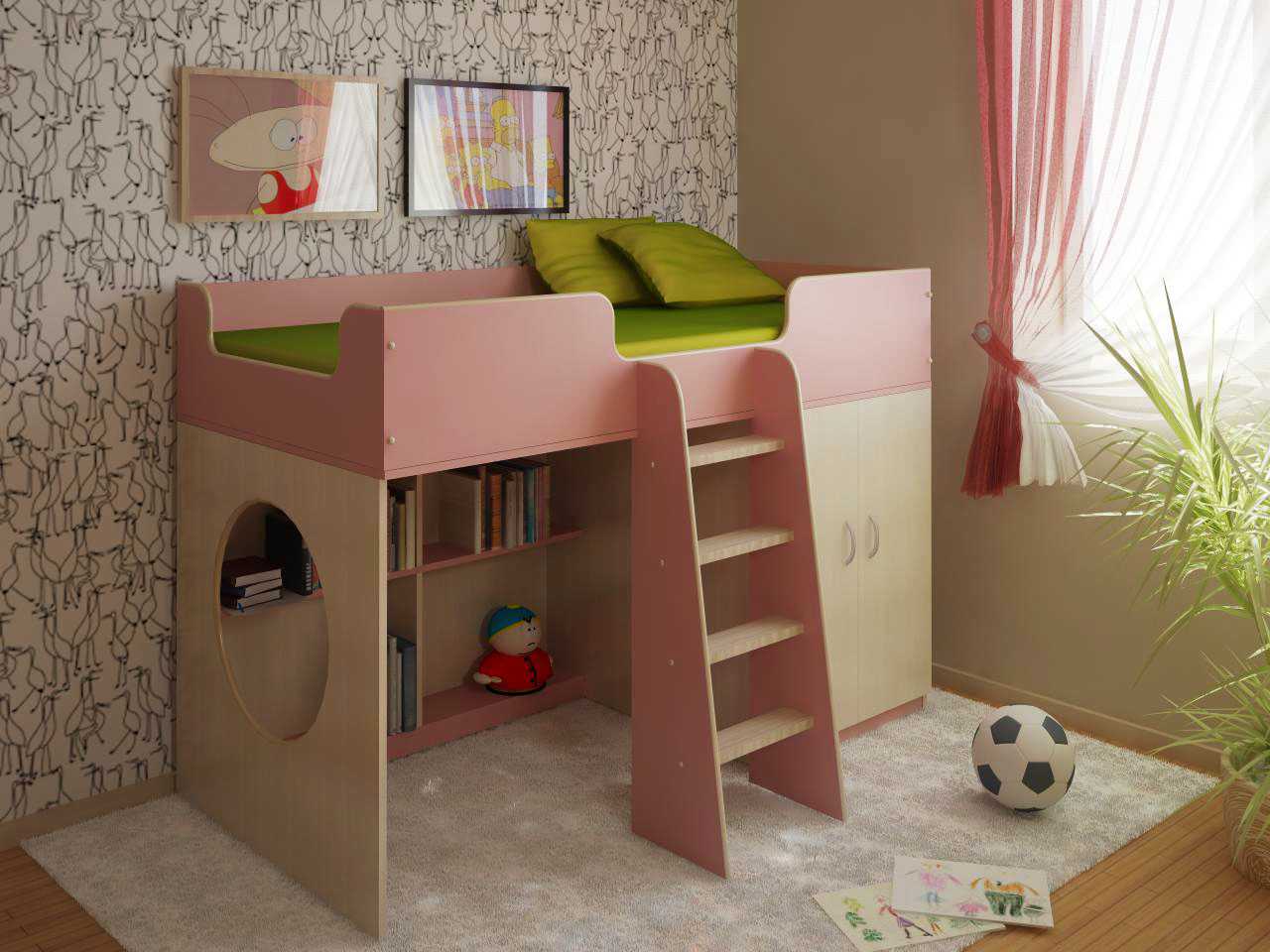 Красивая кровать-чердак розового цвета, расположенная возле окна
