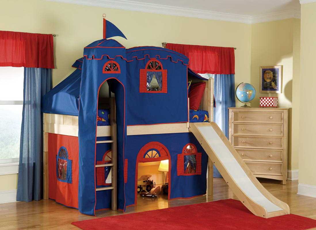 Главное отличие детской двухъярусной кровати от взрослой – это размеры. В остальном особенности конструкции остаются прежними. Спальное место находится на верхнем ярусе, и к нему можно попасть по лестнице. Как обустроить свободное место снизу, каждый решает сам. Самые популярные варианты:
