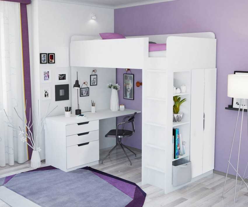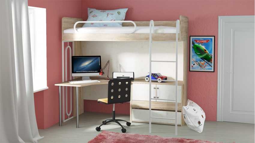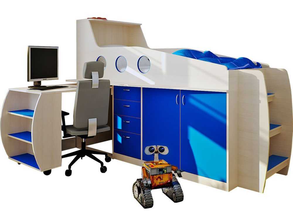 - с полной организацией рабочего места под кроватью (при этом предусматривается наличие полок, места под компьютер, а сама кровать расположена на высоте выше 160 см над уровнем пола).