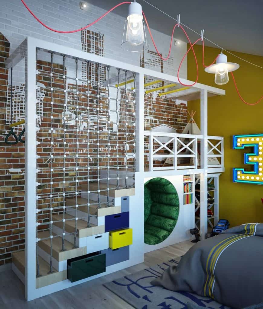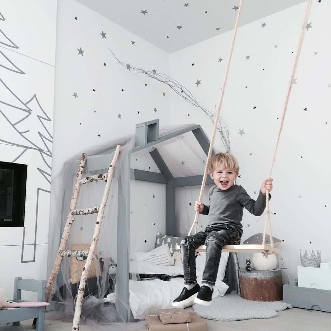 Для маленьких детишек понадобится достаточно просторное место для игр, которое можно организовать за счет отсутствия рабочего уголка. Постелите здесь теплый коврик, поставьте небольшое бунгало, домик или палатку.