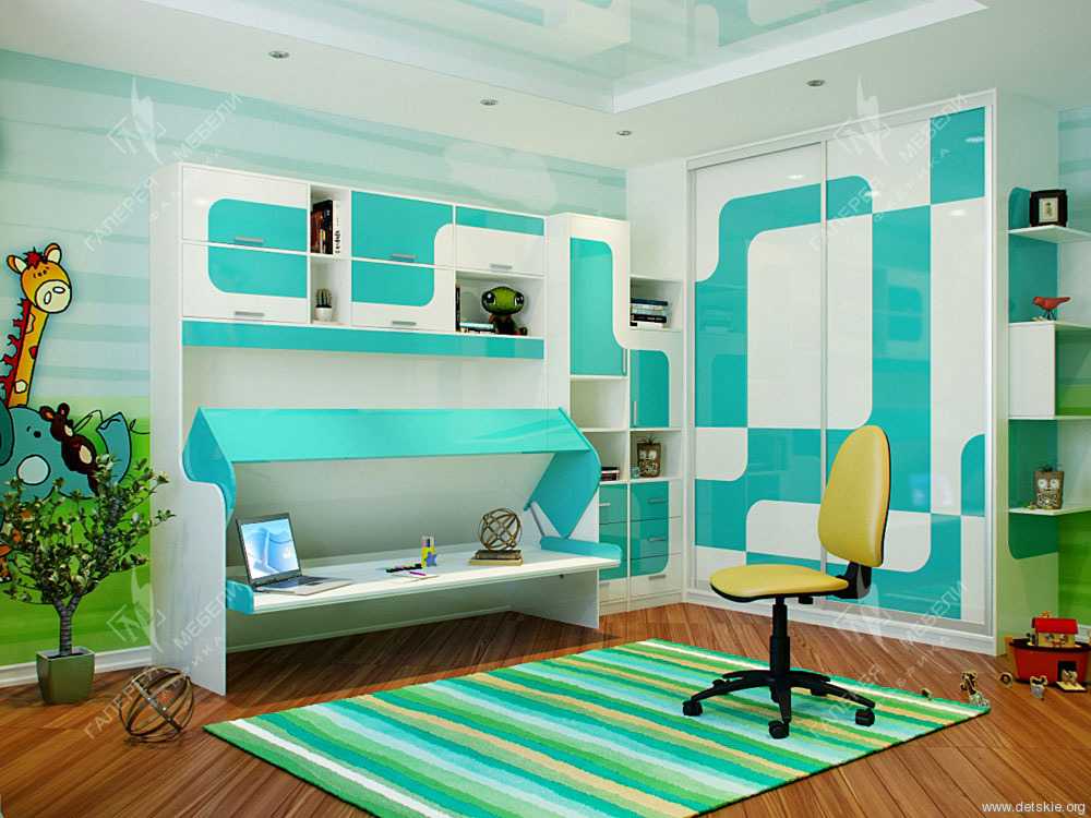 Детский гарнитур имеет не только спальное место, но и шкаф, стол, полки, тумбы. Все должно быть выполнено в одном стиле и создавать законченный образ комнаты. Существуют модульные варианты, позволяющие комплектовать мебель самостоятельно.