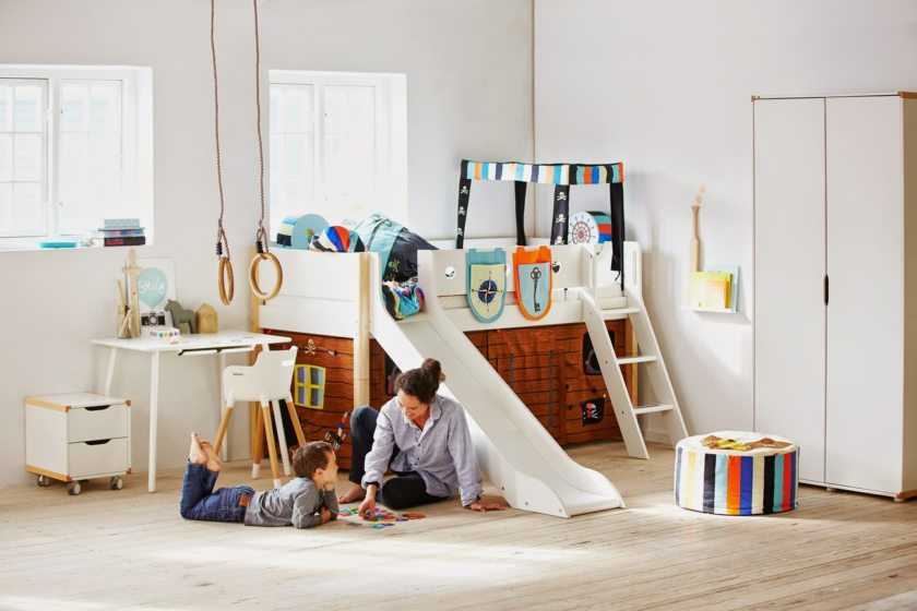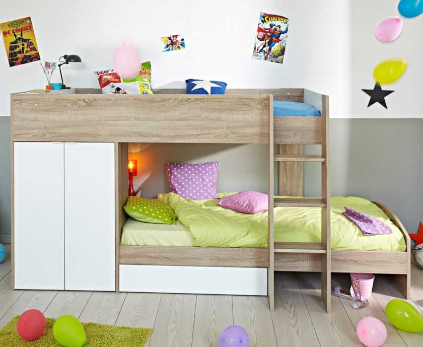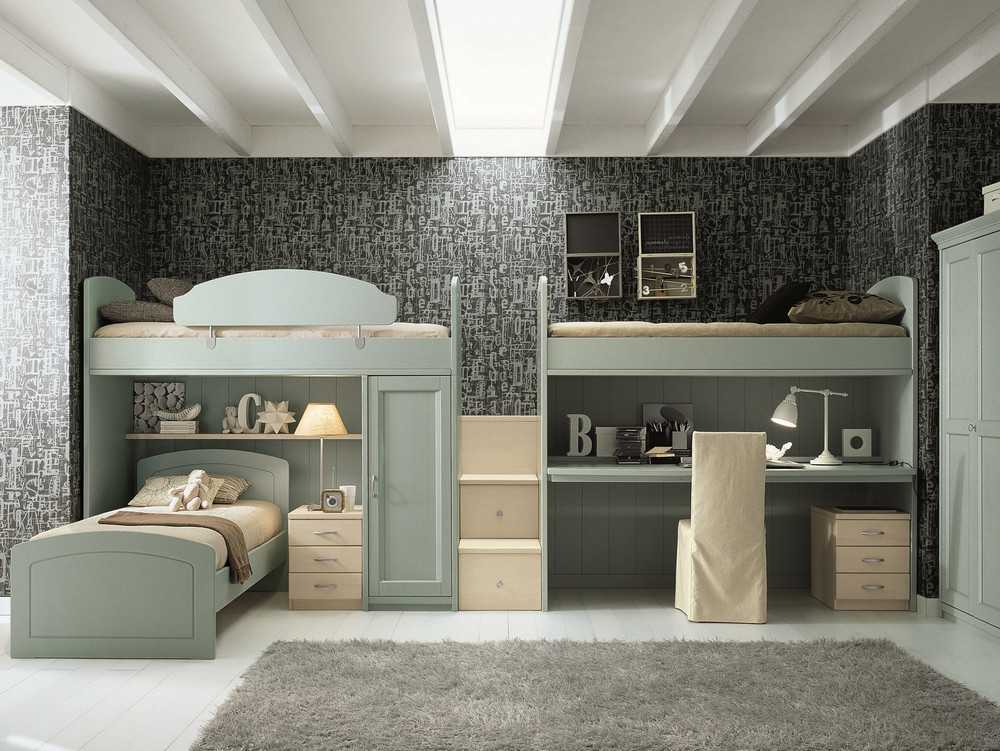 В некоторых случаях нижний уровень отводится для стола или игрового места. Если в семье два ребенка, целесообразно устанавливать кровать с двумя спальными местами, расположенными одно над другим. Для такой мебели особое значение имеет безопасность ребенка, находящего на верхнем ярусе, поэтому ее оборудуют бортиками и лесенками. Обычно нижний этаж занимает младший ребенок, а верхний – старший.