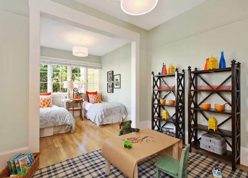 Разделение спальни и игровой зоны с помощью мебельной перегородки, цвета стен и напольного покрытия