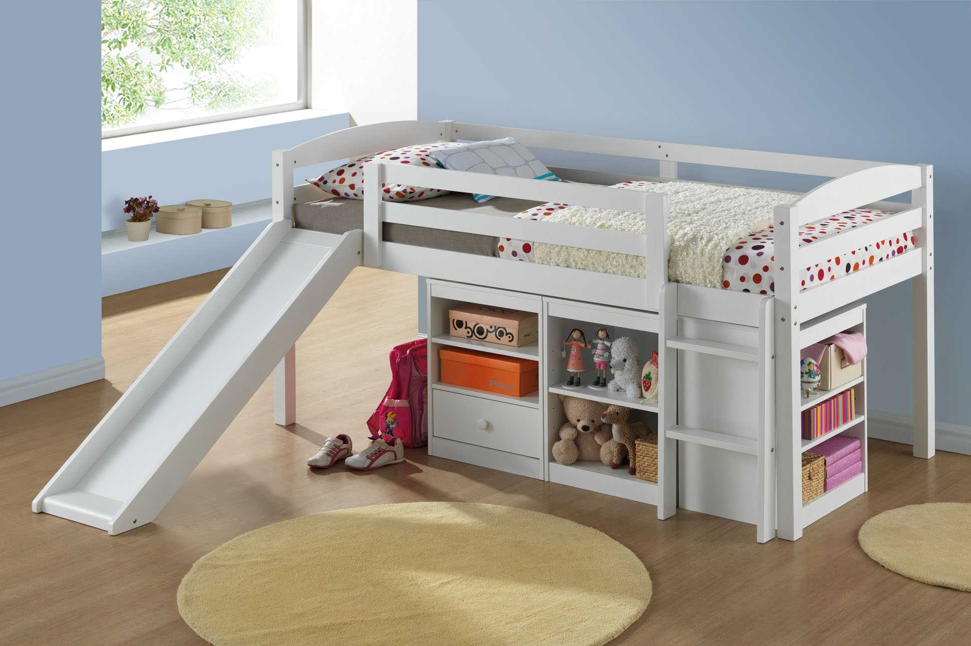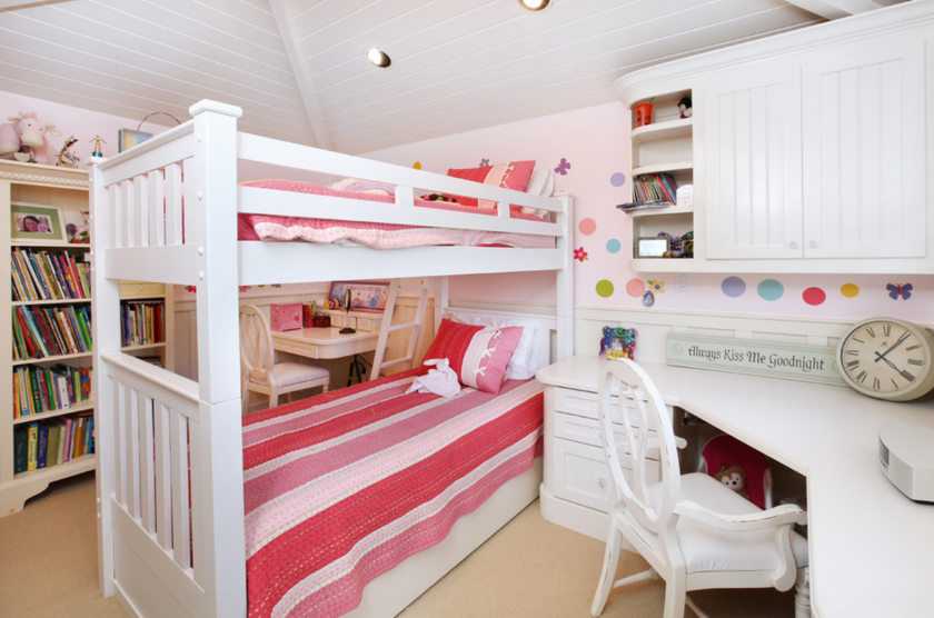 Одним из главных и обязательных предметов интерьера спальной зоны в детской комнате, безусловно, является кровать. По возможности, предпочтительно предоставить каждому ребёнку по отдельному спальному месту, купив односпальные кровати (для маленьких комнат подойдут двухъярусные или же выдвижные кровати)