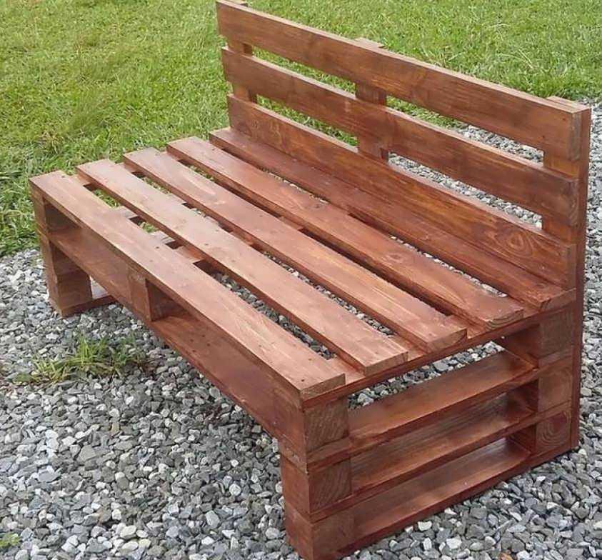 Начинать изготовление скамеек для дачи следует с простой конструкции со спинкой. Разбирать поддон на отдельные детали не надо. Смастерить такую мебель могут все любители. Пошаговая инструкция на изготовление скамьи с планками вдоль сидения и ровной спинкой.