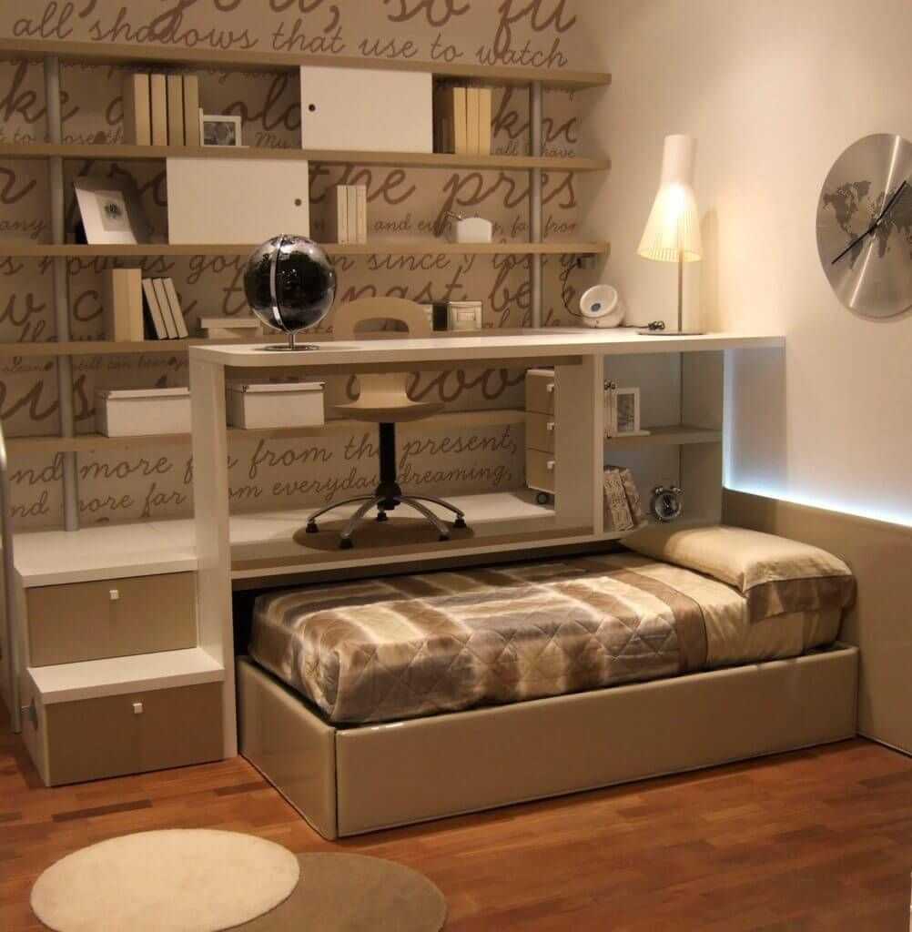 На изготовленном подиуме можно будет расположить: книжные стеллажи, рабочее место или зону игр для ребенка. Если сделать подиум на ширину всей комнаты, в нем можно оборудовать встроенные секции для хранения личных вещей.