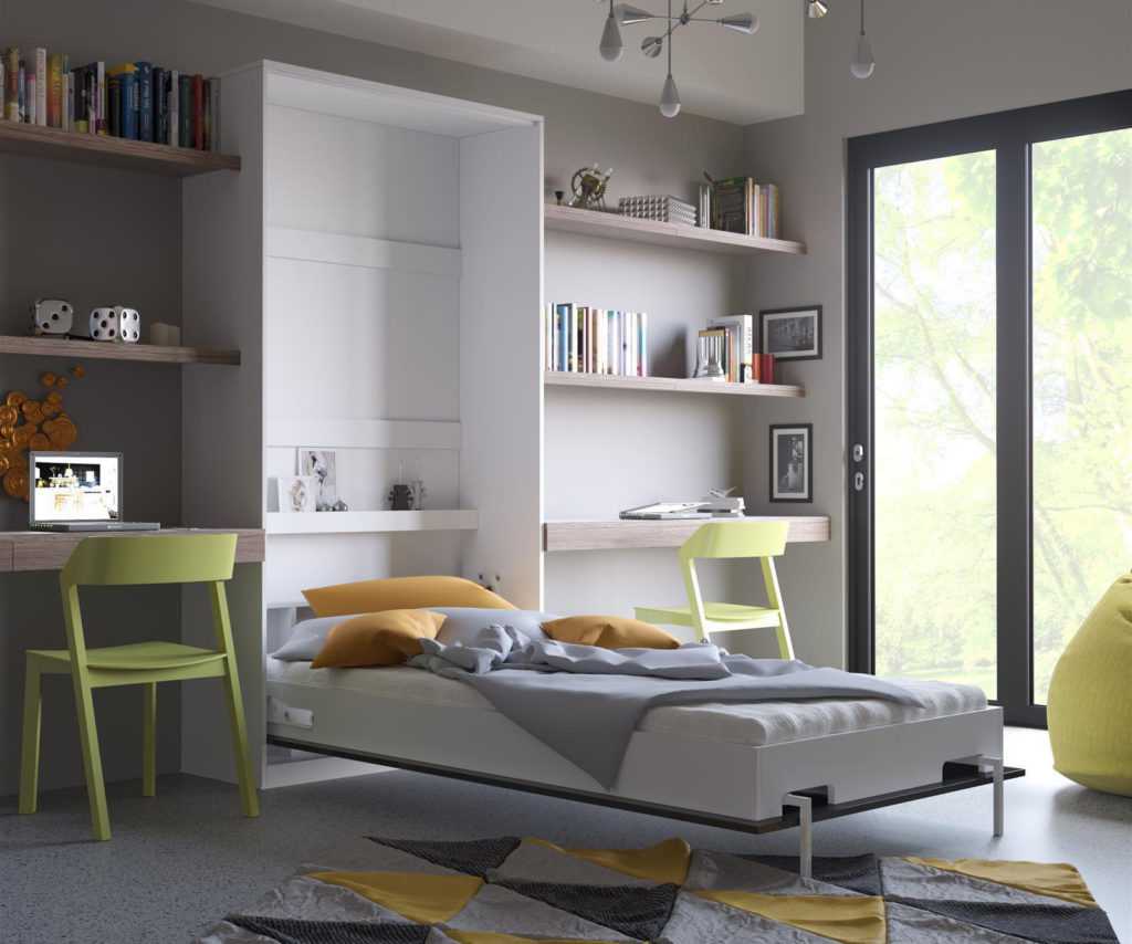 В большинстве случаев такие решения используются для односпальной кровати. При подобном подходе ее можно встроить в корпус стола или гарнитура, не сильно искажая целостность восприятия интерьера. Поскольку нагрузка на конструкцию и элементы крепления здесь существенно ниже, механизм может иметь упрощенное исполнение. Впрочем, это не относится к сложным схемам, реализующим принцип трансформации в нескольких плоскостях (например, выдвижной + раскладной).