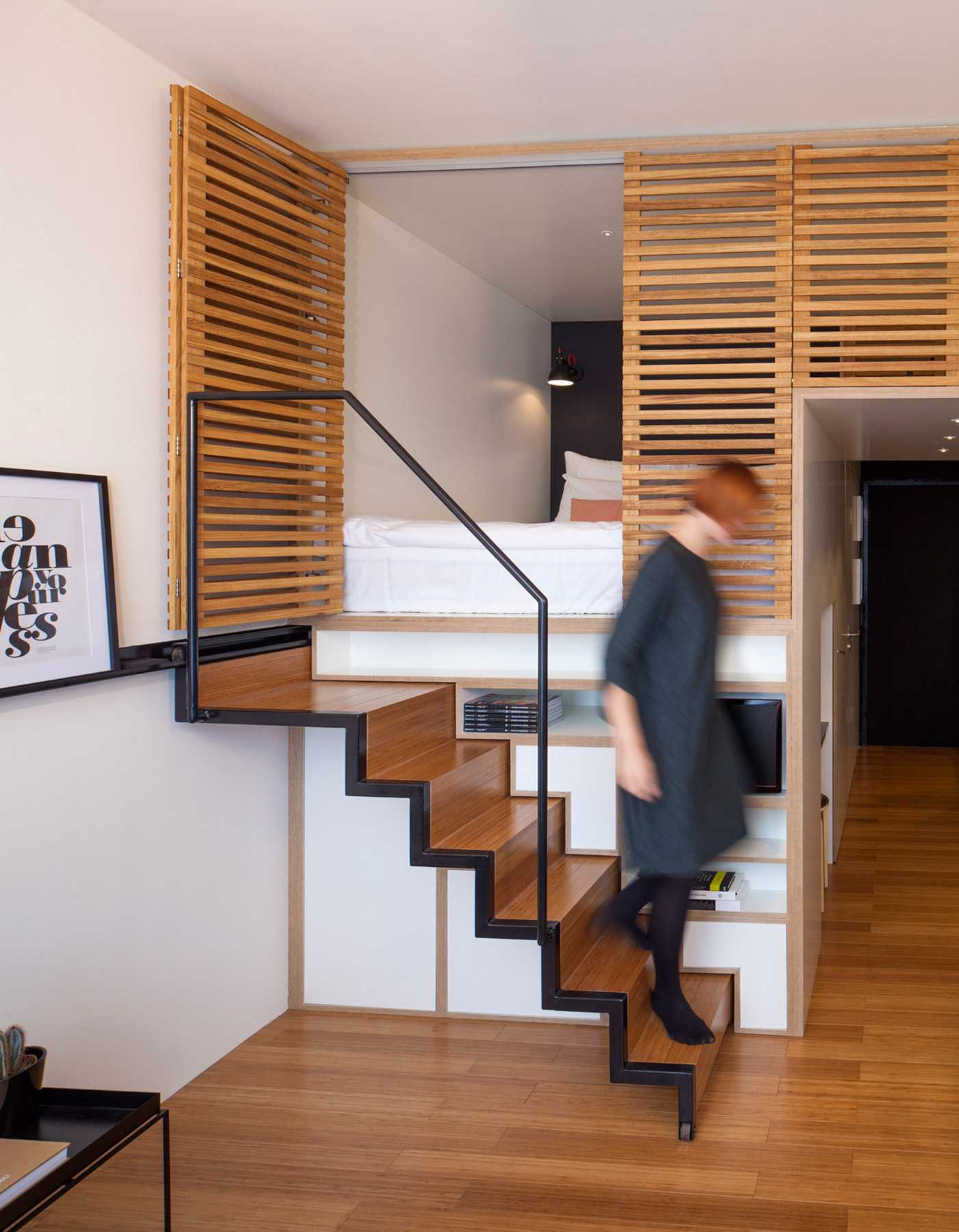 Если вы счастливый обладатель высоких потолков, обратите внимание на кровать с жесткими направляющими. Она постоянно будет находиться на одном месте, а чтобы устроиться на ней, нужно воспользоваться лестницей
