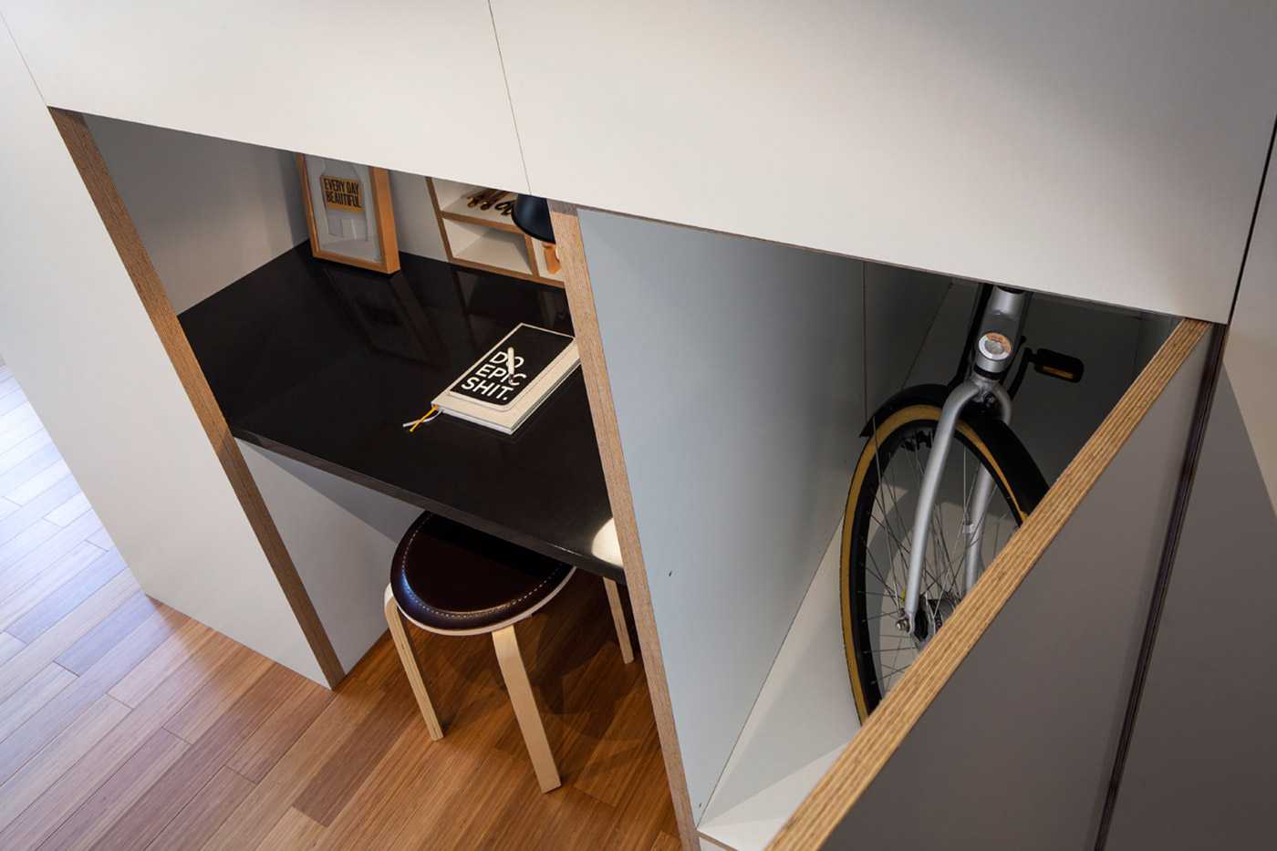 Этот проект был реализован в Амстердаме. На площади в 24 квадратных метра уместилось все необходимое для обустройства жилого помещения или домашнего офиса, что стало возможным именно благодаря использованию кровати-чердака. При этом комната выглядит просторной и очень уютной, вполне пригодной для работы и приёма гостей.
