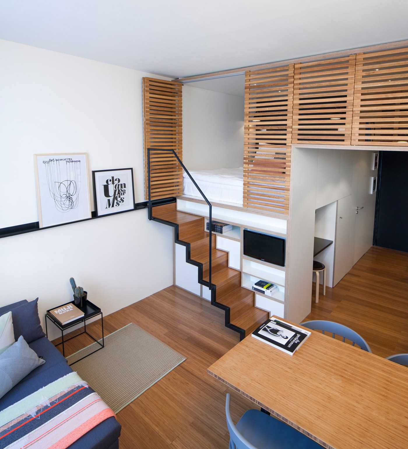 Маленькая квартира не может порадовать хозяев наличием большого количества свободного места, поэтому жильцам приходится стараться максимально полезно использовать каждый сантиметр площади. Вполне естественно, что, несмотря на ограниченное количество квадратных метров, люди хотят иметь полноценное жилище со спальней, кухней, гостиной, а в некоторых случаях и рабочим кабинетом. Поэтому вполне актуальным становится вопрос, как в условиях небольшой квартиры, реализовать все это. Грамотная организация малогабаритного пространства: расположенное под потолком спальное место с выделенной зоной для работы под ним, а ступени, ведущие наверх к кровати служат в качестве ящиков.