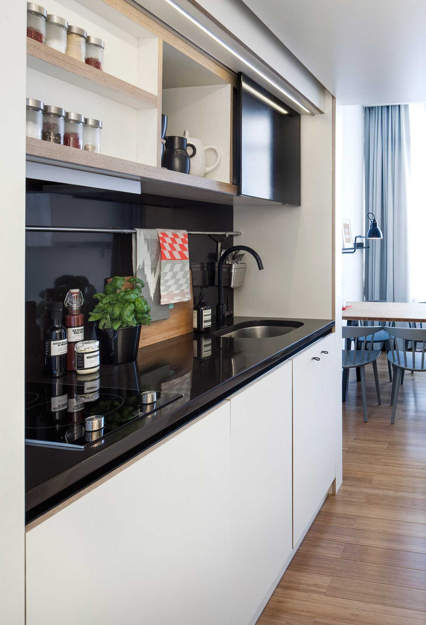 Дизайнерам удалось обустроить небольшую гостиную зону, расположив её рядом с мини-кухней