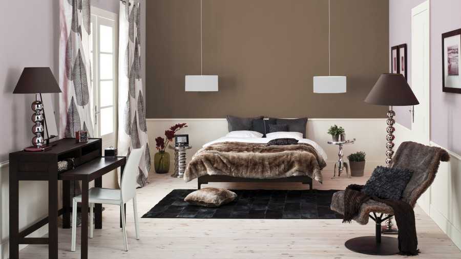 При помощи темных и густых красок можно выделить одну из зон в комнате. Используя разные краски, выполняют визуальное зонирование. На фоне основной цветовой палитры светлых тонов темные оттенки контрастируют, обозначая определенный участок.