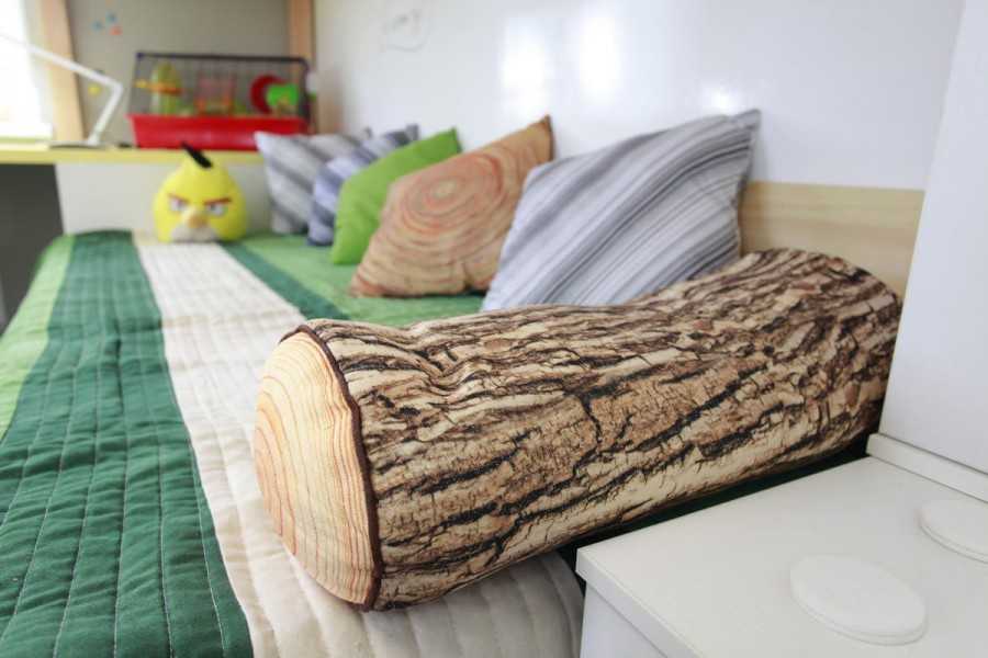 Маскировка кровати подходящим текстилем и подушками. Порой, можно не слишком усложнять деление «спальня и гостиная» в комнате. Достаточно лишь хорошо вписать спальную поверхность в общий дизайн, например покрывалом, сочетающимся со шторами или обивкой кресел и россыпью декоративных подушек, которые будут убираться на ночь.