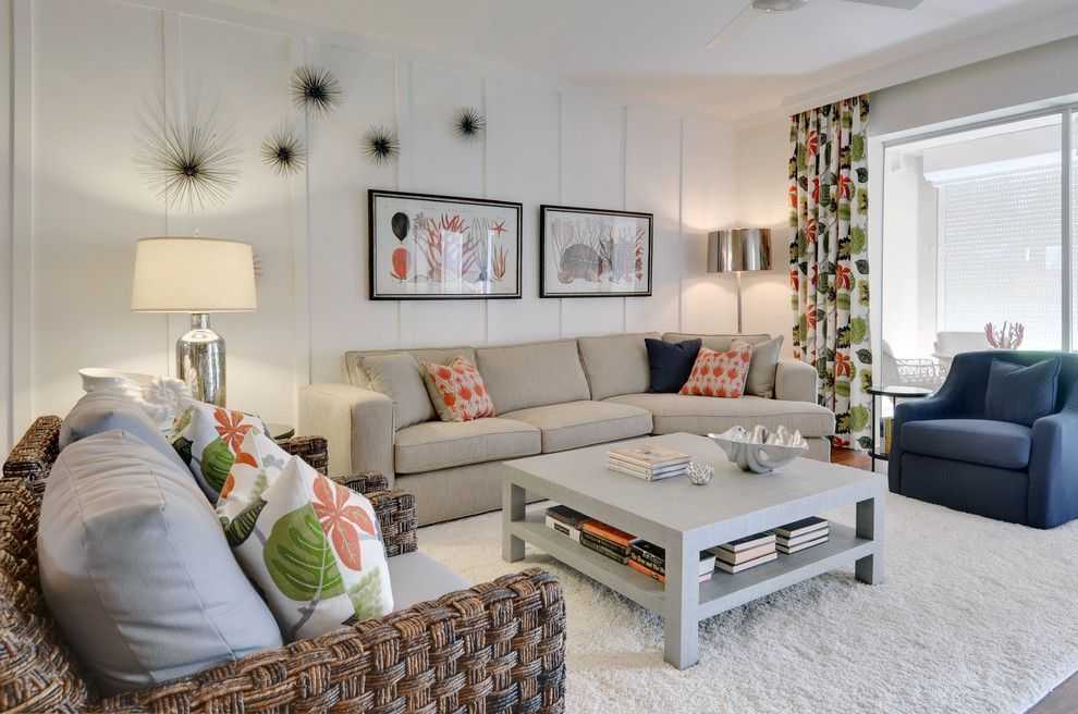 Если в самой квартире имеется наличие других комнат и площадь достаточно большая, то выделяют отдельно зал-гостиную для времяпровождения с гостями. Самое распространенное, что хотят увидеть владельцы – это наличие дивана, двух кресел и журнального столика посередине. Для обозначения границ, выбирают нужной ширины ковер и стелют его. Для более современного вида, чтобы не было как у всех, добавляют в интерьер необычных элементов. Например, выделить стену с телевизором. Вокруг телевизора выложить декоративными кирпичами. Повесить большие часы и стильные картины. Сам диван не обязательно ставить к стене, можно расположить посередине комнаты.