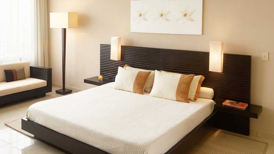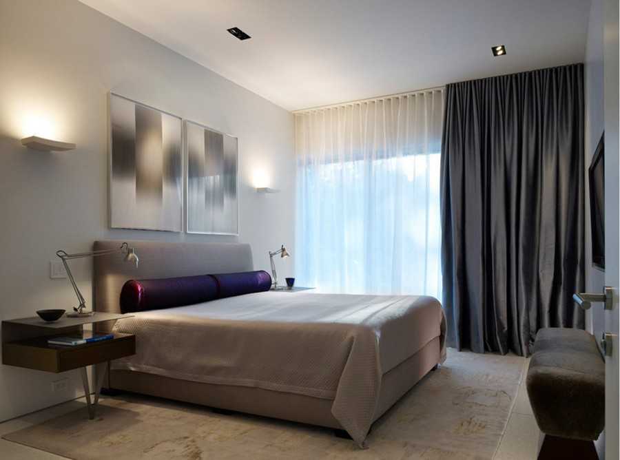 Следуя минимализму, надо отказаться в спальне от лишних элементов мебели и яркого декора.