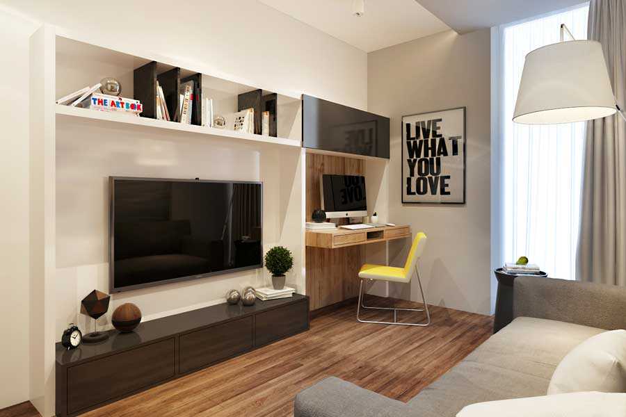 Неплохо провести эксперименты с освещением разной степени интенсивности, которое поможет более детально выделить акценты на необходимые зоны. Кроме того, используйте некоторые хитрости: шкаф — купе на сегодняшний день будет лучшим решением практичности и эстетичности, тумбочка под телевизором захламляет пространство — используйте поворотный навесной кронштейн для лучшего обзора со всех точек комнаты.