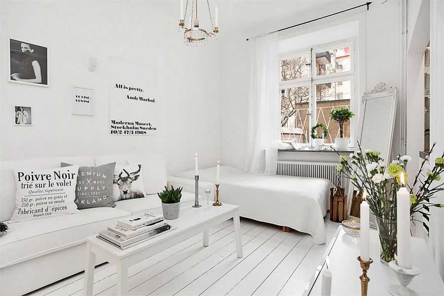 Используйте мебель без видимых ножек — это позволит вашей комнате визуально быть просторней, кроме того, не исключайте использования трансформируемой мебели, это позволит вам сэкономить и без того драгоценное пространство. Не используйте громоздкие шкафы, а вместо кресел, возможно, использование мягких пуфиков. Задача упрощается, если в квартире проживает один человек.
