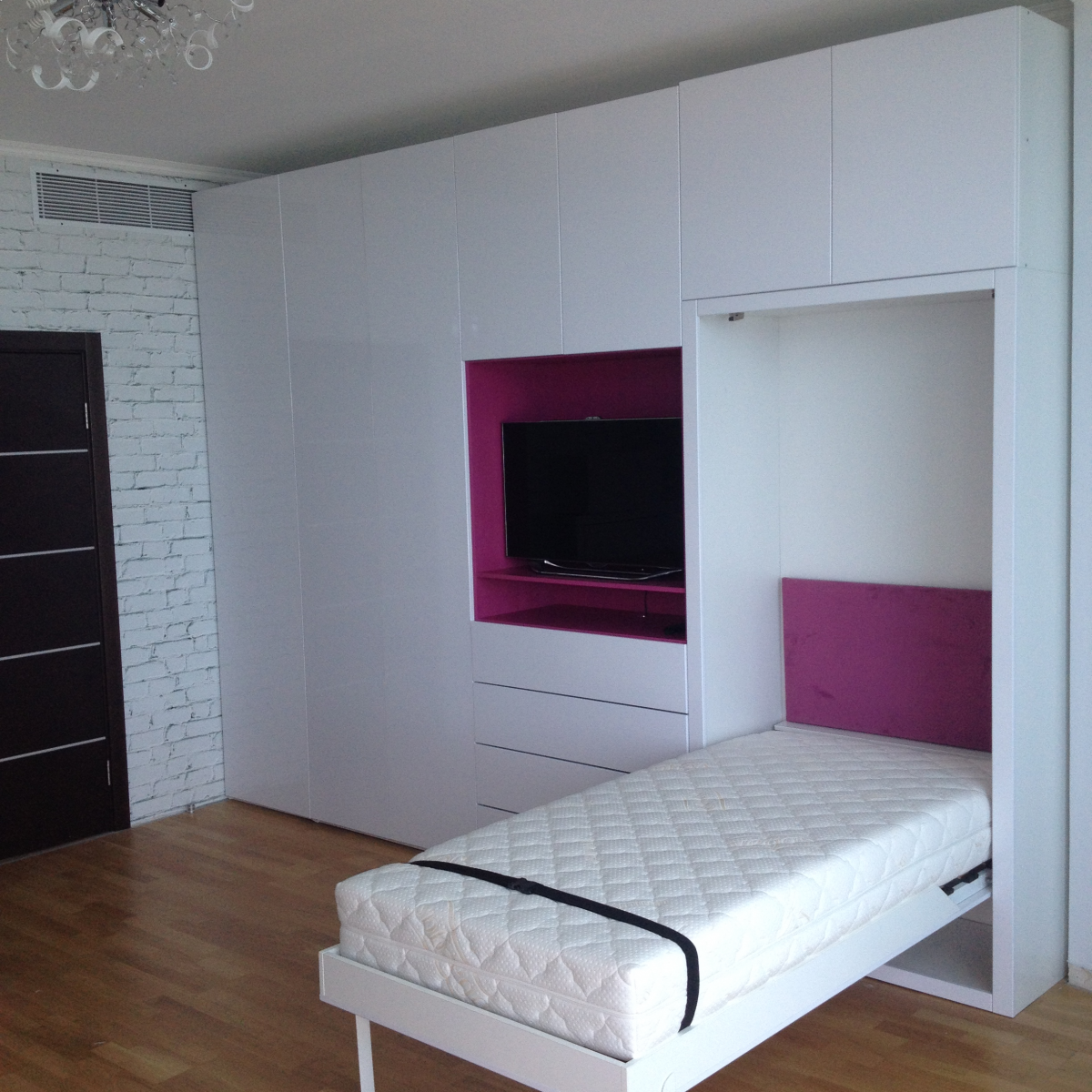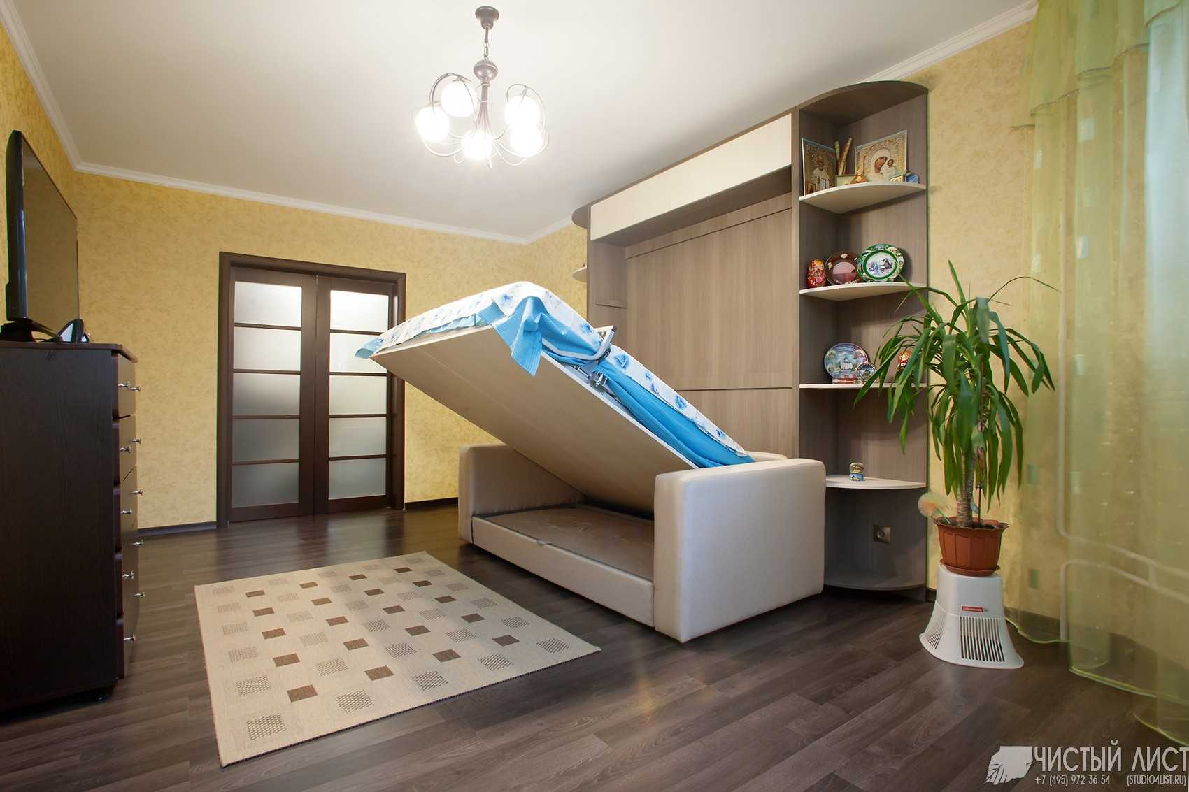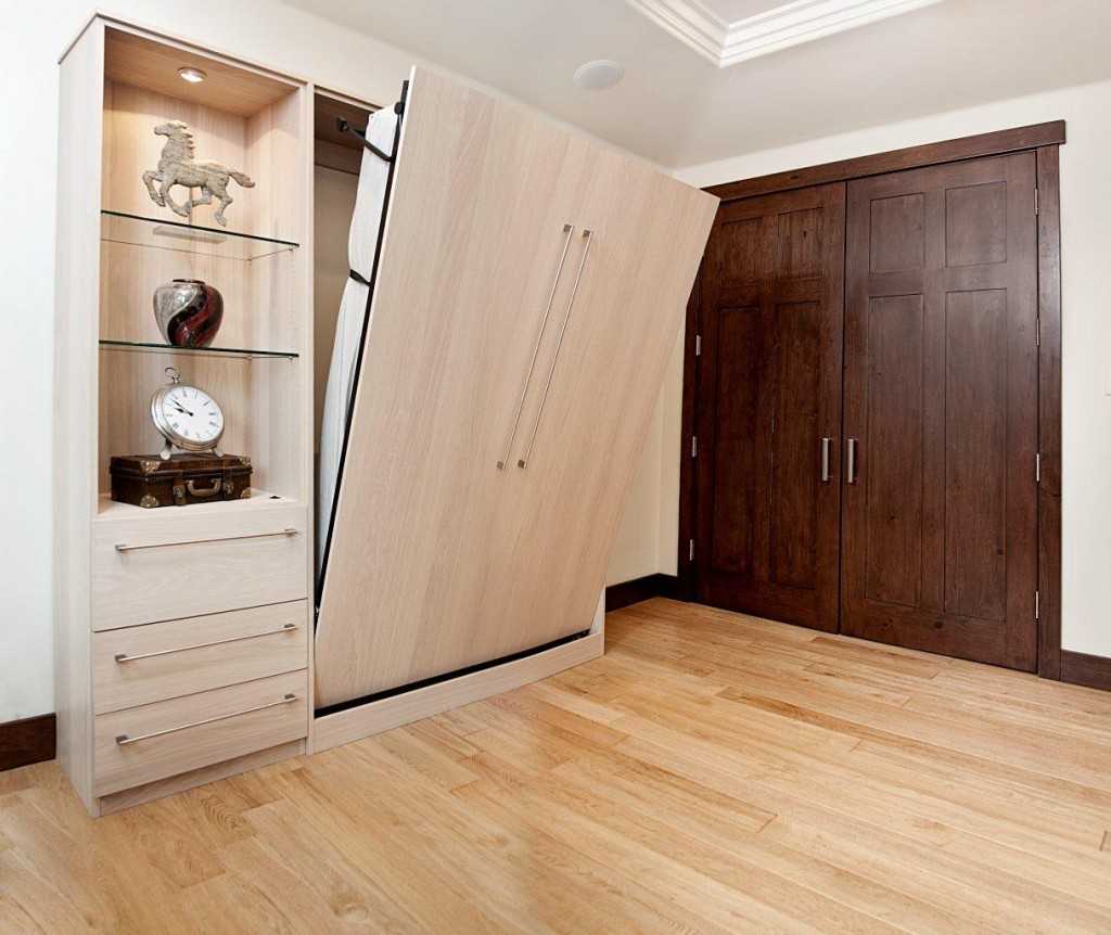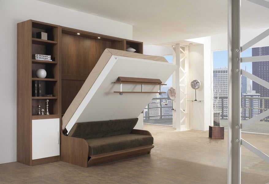 Модель при складывании превращается в гармошку и скрывается внизу ниши. Мебель можно установить в зале. Над ней есть место, чтобы расположить полки, плазменный телевизор, небольшие шкафчики для разных предметов, одежды.