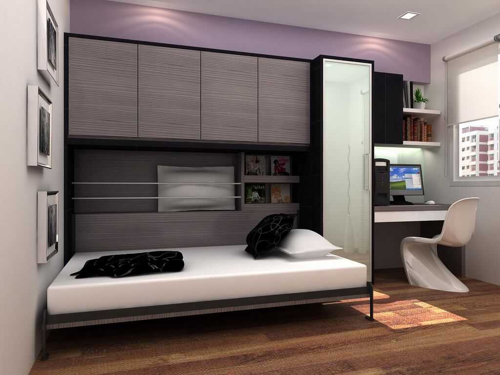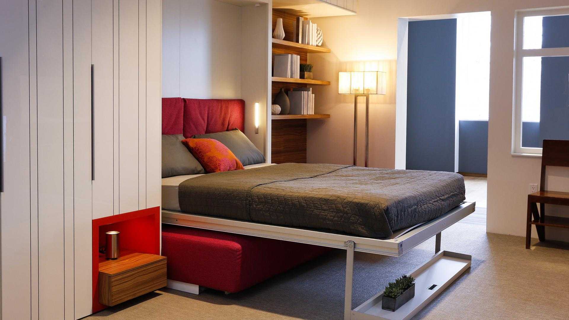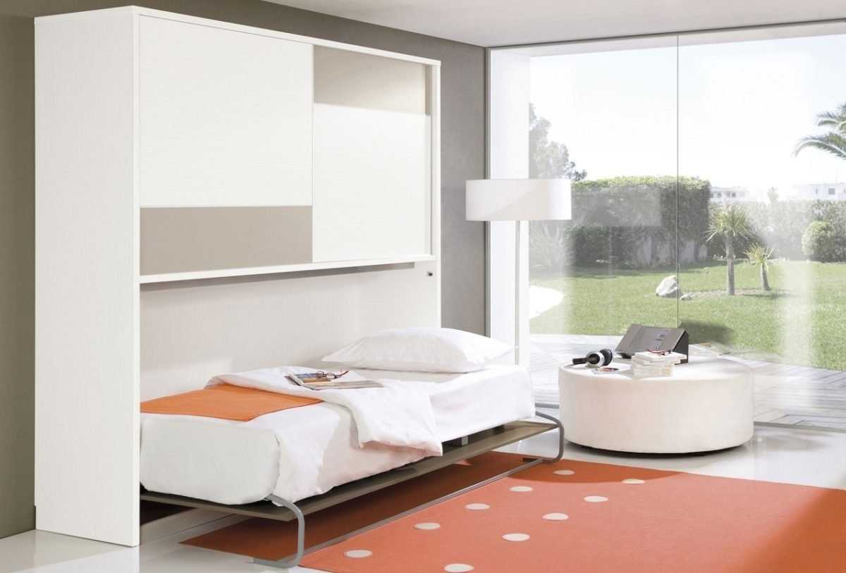 Откидная кровать отлично впишется в квартиру студийного типа или с обычной планировкой. Она может примыкать к стене горизонтально или вертикально с помощью различных механизмов. В разложенном виде основание с матрасом размещается на ножках.