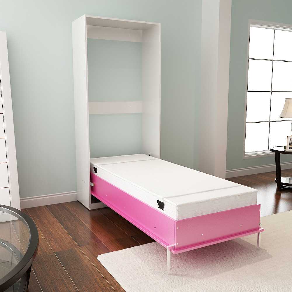 - Односпальные – 80 х 200 см и 90 х 200 см. В горизонтальном устройстве боковая сторона располагается по длине стены, а подъемное устройство на длинном ребре. В вертикальной конструкции на торец кровати крепится подъемное устройство. Потайное место имеет вид пенала, комода, тумбочки, шкафа.