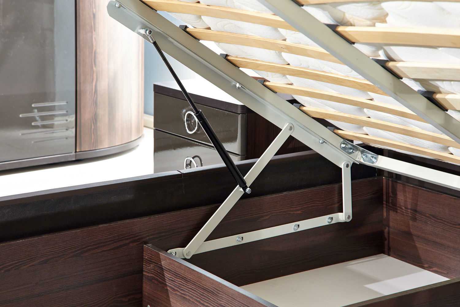 - Модели с газовым лифтом. Устройство в действие приводит газовая пружина-амортизатор. С плавным легким подъемом и мягкой доводкой устройство не нанесет травмы владельцу. Ее устанавливают на все размеры кроватей с разным откидыванием.
