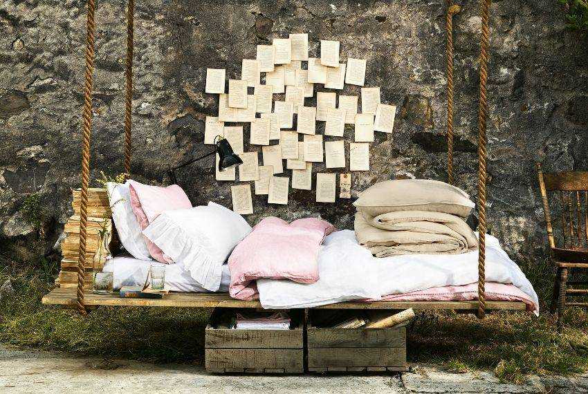 Качелька-лежанка для отдыха и развлечений ребенка, сделана из деревянного поддона