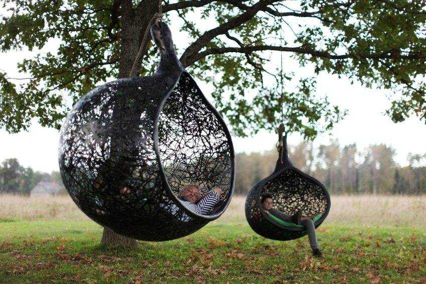 Качеля–кокон — своеобразная форма и то, что она вызывает ощущение, ассоциацию с уединённым отдыхом.