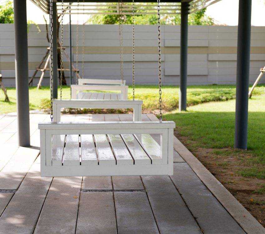 Классический и наипростейший вариант – это качели из доски на веревках. Хватит четырех дырок по краям и вдетого в них шпагата. А также в качестве сиденья можно использовать деревянную решетку, спил бревна, старый стул без ножек.