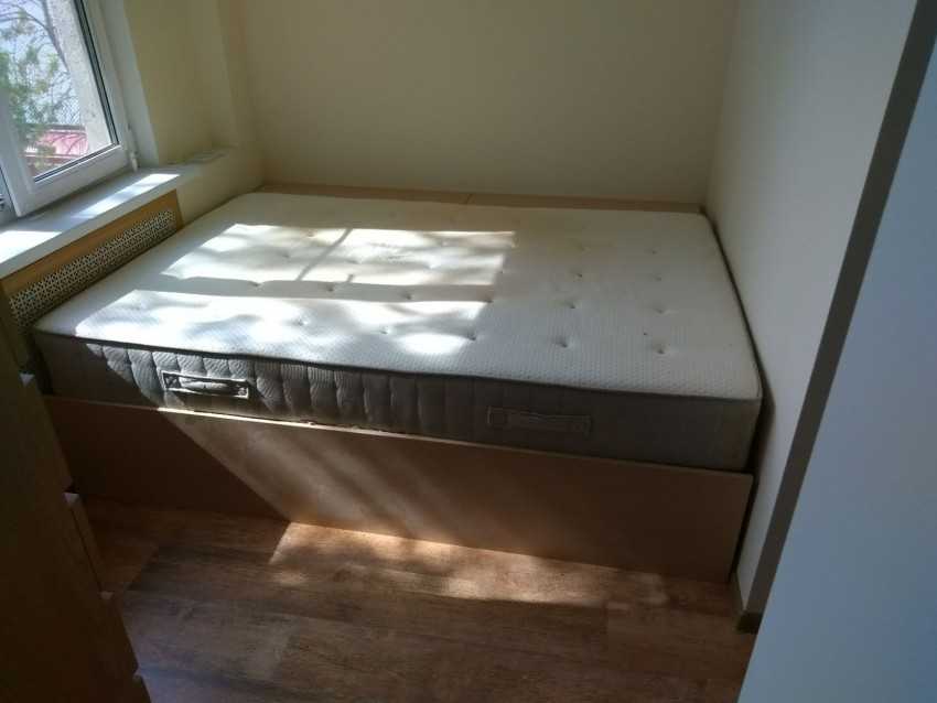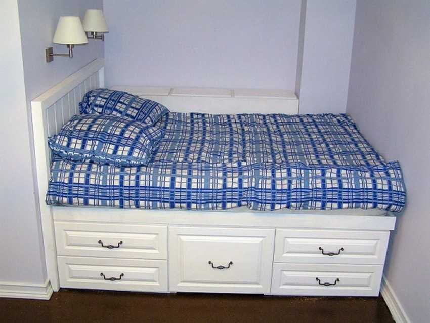 - Кровать-подиум с системой хранения под кроватью и полками, которые загораживают постель от остальной комнаты, будет очень практичной. Сделав из полок ступеньки и застелив их ковролином или мягким покрытием, можно беспрепятственно залезать на кровать и иметь множество места для хранения разнообразных вещей. Обычно высота подиума равна 50 см, а высота матраса зависит от выбранной модели. Классические размеры односпальной кровати будут 90-120 х 195-205 х 35-45 см;