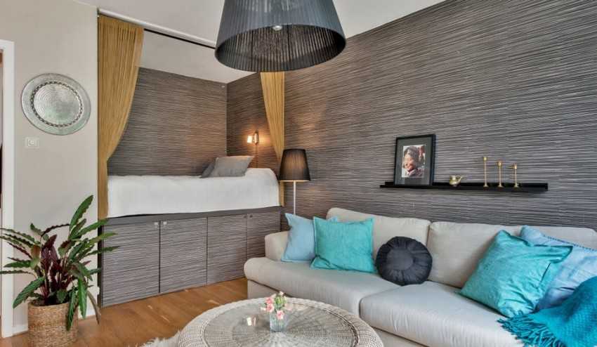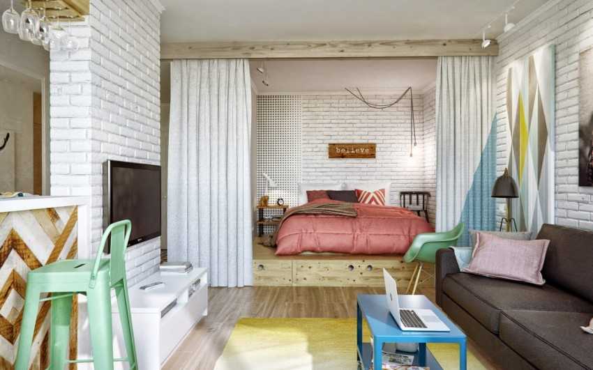 - В однокомнатной квартире или квартире-студии тканевые пологи создают отдельную укромную зону и скрывают спящего человека от посторонних взглядов.