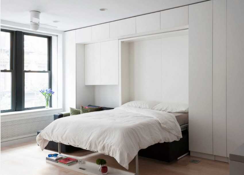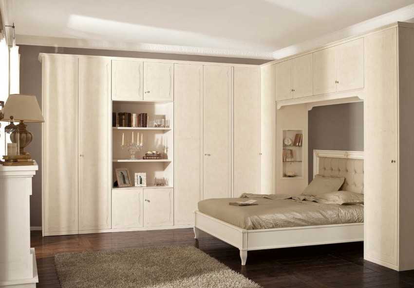 - Гардероб под кроватью является интересной задумкой. В зависимости от толщины матраса, высота такой кровати составляет около 85-90 см. Ширина зависит от модели и варьируется в пределах 100-180 см, длина стандартная — 195-200 см. Там вещи хранятся в сложенном виде и на вешалках. Конечно, это не касается длинных платьев, но блузы и рубашки вполне смогут размещаться в вывешенном виде. Попасть в гардероб можно, подняв кровать и открыв дверцу. В шкафу можно не только развесить вещи, но и разложить их на полки. Эта идея подойдет для маленьких комнат. Конечно, итальянская кровать-гардероб стоит достаточно дорого, однако, если необходимо обустроить маленькую площадь, данный вариант предпочтителен. Так как матрас расположен высоко над поверхностью пола, к постели ведут ступеньки, которые могут быть оборудованы ящиками.