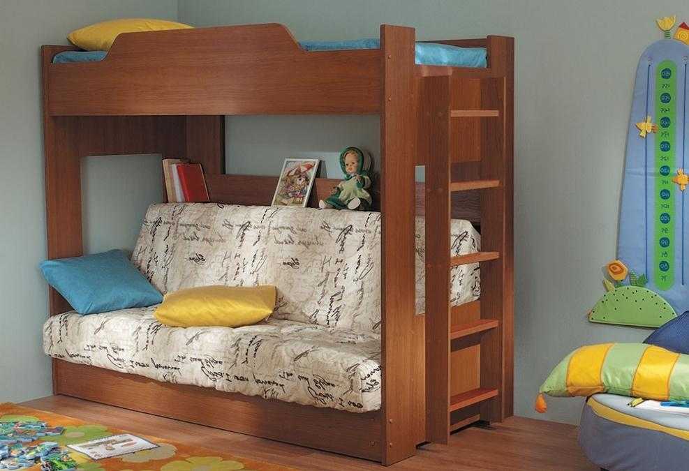 - Кровати-трансформер. Модели, трансформирующиеся из двухъярусной кровати в диван. Не требуют для трансформации много места, просты в управлении. Механизм надёжный и долговечный, а верхний ярус в среднем рассчитан выдерживать вес среднестатистического взрослого человека. Вариантом данной модели множество, в том числе и тот, в котором нижнюю часть возможно разделить на два полноценных спальных места.