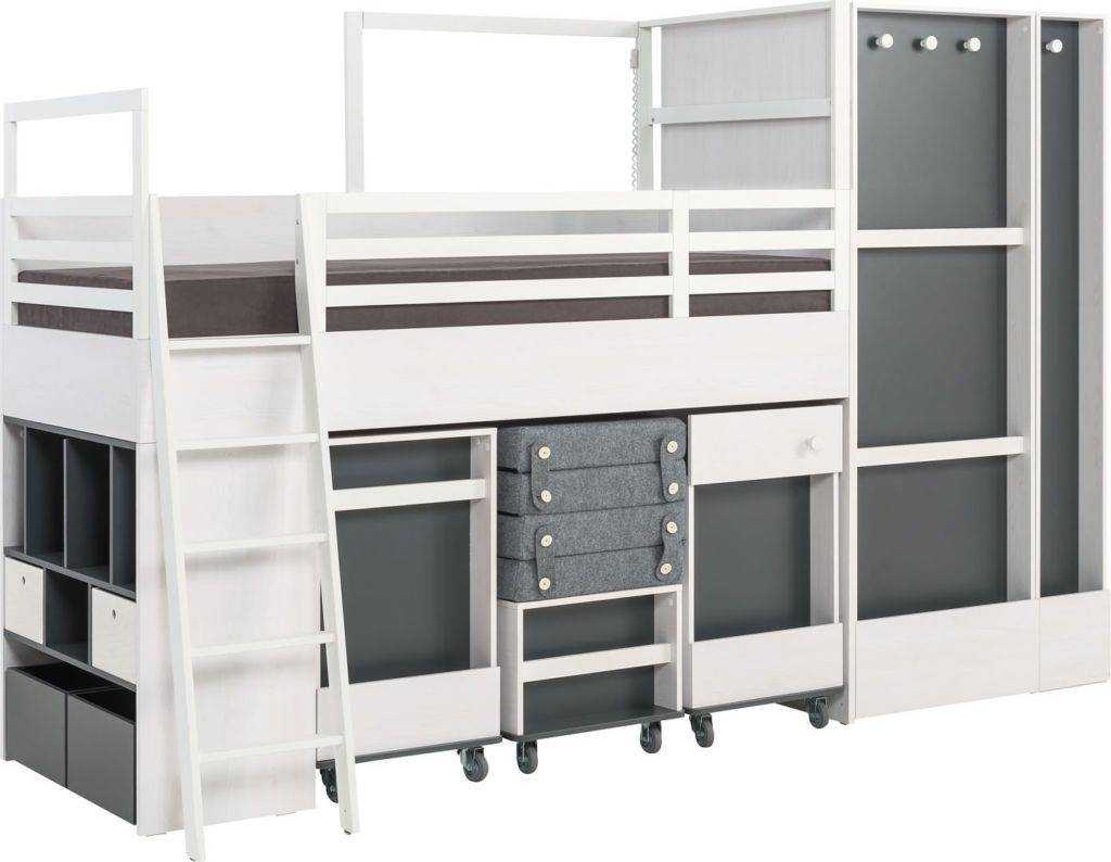 - Двухъярусный каркас «Туффинг» темно-серого цвета можно поставить в комнате с низкими потолками, так как его высота – всего 130 см. Лестница находится по центру, поэтому ребёнок, спящий на нижнем ярусе точно не упадёт, а наверху установлены сетчатые бортики.