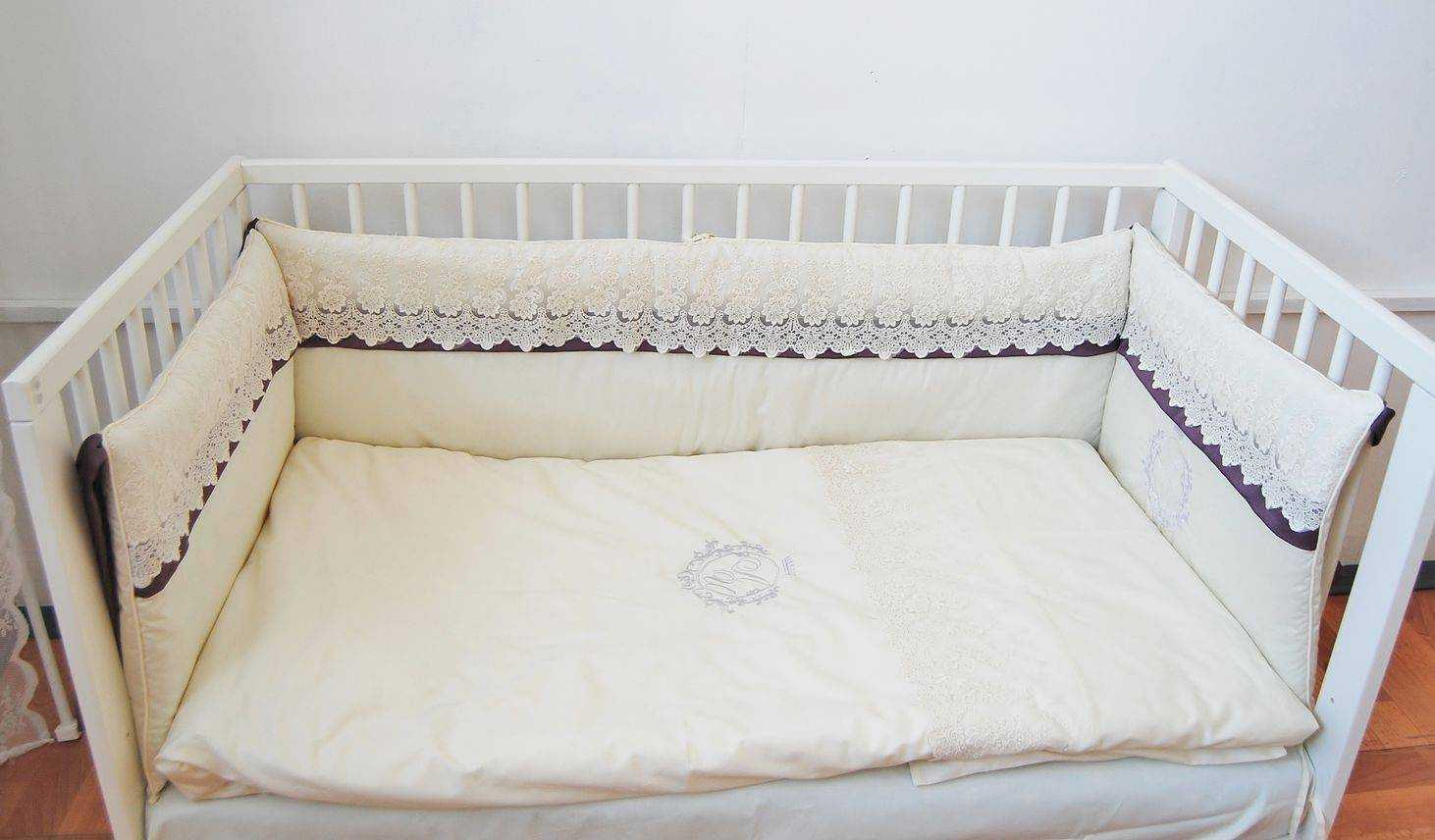 Если же набор белья включает в себя бортики, бамперы или наматрасник — оно должно подбираться строго по размеру кроватки, поскольку крепления этих элементов разработаны строго в соответствии с размером кроватки.