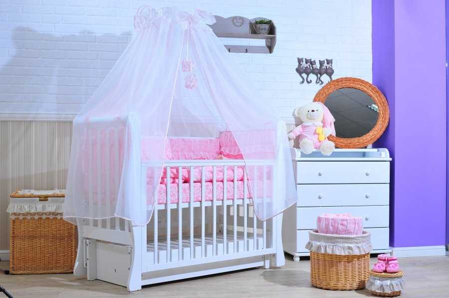 Существуют белоснежные сеточки и плотные ткани, из которых шьют этот аксессуар. Легкий балдахин, напоминающий тюль, спасет ребенка от москитов, если на окнах нет специальных сеток. Его можно брать с собой на прогулку, чтобы накрывать коляску, защищая кожу малыша от кровососущих и назойливых насекомых. Изделия из плотной ткани удобно использовать для обеспечения темноты вокруг спящего ребенка. Это особенно функционально для однокомнатных квартир и квартир-студий, когда у малыша нет своей комнаты. Если родители допоздна любят смотреть телевизор, его отблески не будут тревожить детский сон